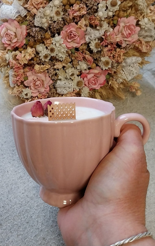 Svíčka v keramickém hrníčku, ktery jde použít po vyhoření jako hrníček na kávičku. Elegantní a krásný hrníček. Svíčka zdobená sušeným růžemi.