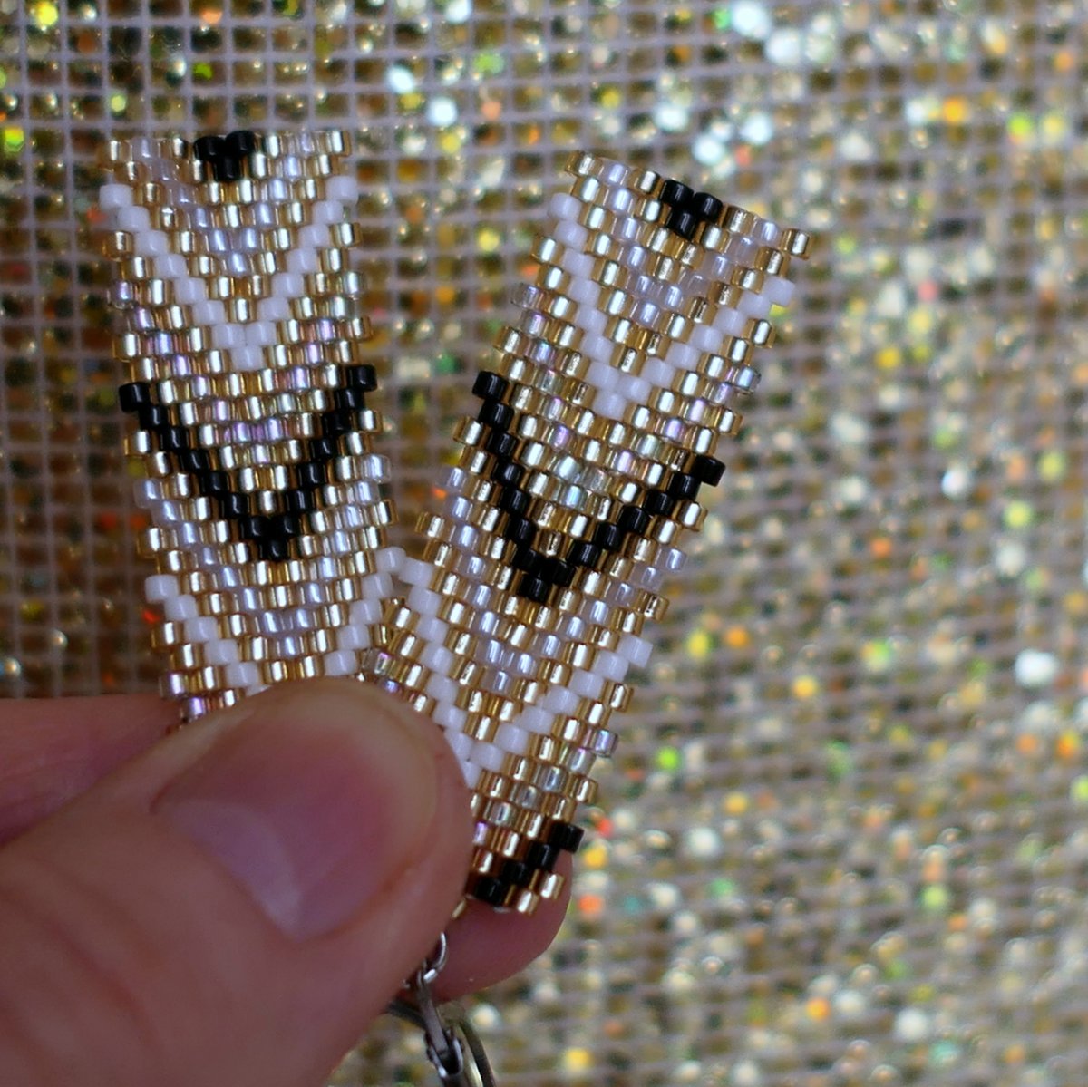 Ušito z japonského rokailu Myiuki barvy zlaté, bílé, černé, čiré a šedé s duhovým listrem.