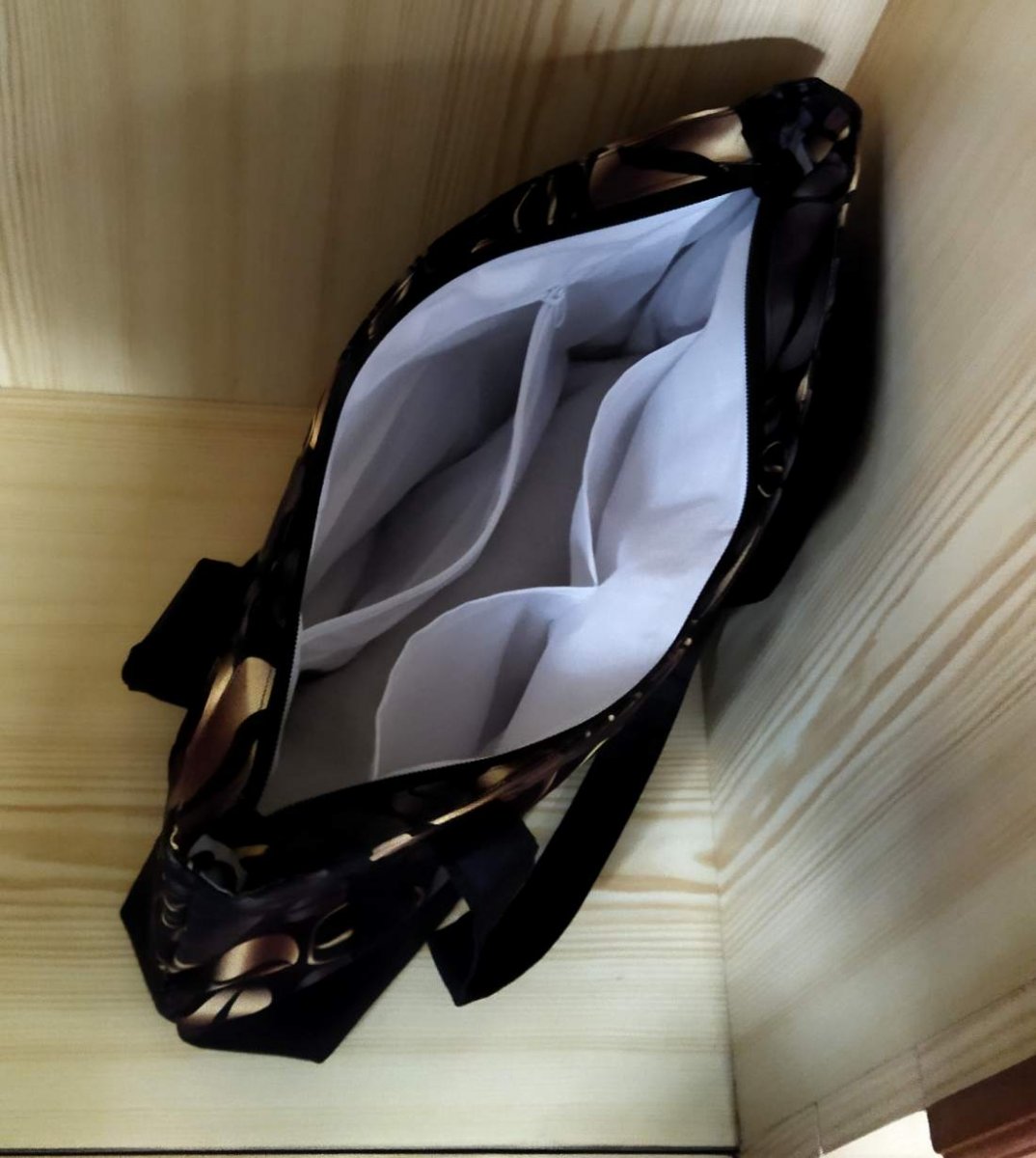 Druhá vnitřní kapsa dělená (šíře 24cm (2x12cm), hloubka 16cm) – ideální na drobnou kosmetiku, kapesníky, brýle nebo psací potřeby.
