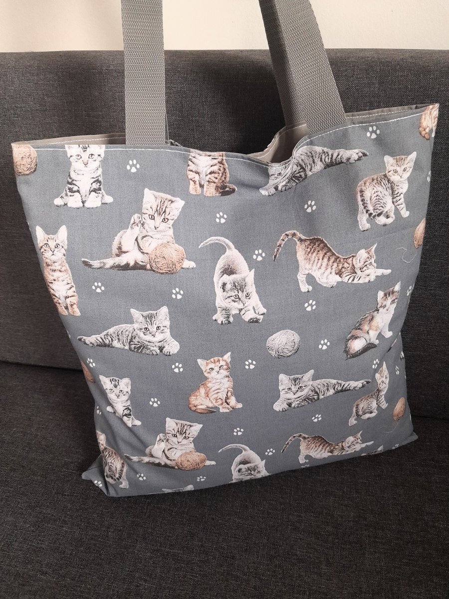 Nabízím tašku šitou z látky plné kočiček. Zadní strana je stejná. Taška je vypodšitá s vnitří kapsou. Horní lem je dvakrát prošitý aby pěkně držela. Ucha jsou dostatečně dlouhá pro nošení v ruce i přes rameno. Zapínání na magnetek.