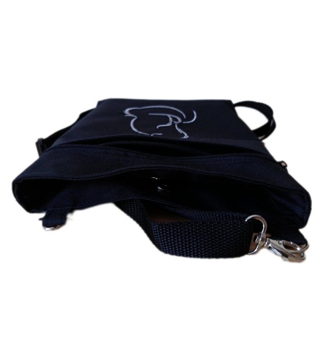 Velká zapínání na patent, přední zapínání na zip a v ní ještě jedna malá na zip pro uschování důležitých drobností. Popruh lze posunout podle potřeby.