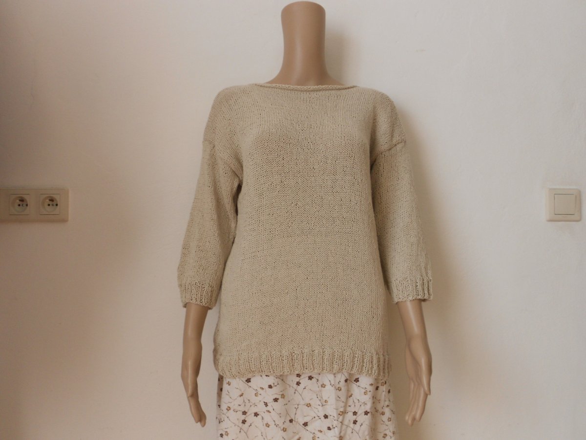 Dámský ručně pletený, tenký svetřík, nebo halenka s 3/4 rukávy, přírodní hedvábí. Lodičkový výstřih, který umožňuje různé způsoby nošení. Velikost L,XL, možná i XXL: délka 61 cm, šířka 53cm, vnitřní délka rukávu 37 cm. Trochu světlejší než na fotografii. Doporučuji jemné praní a sušit volně položené.