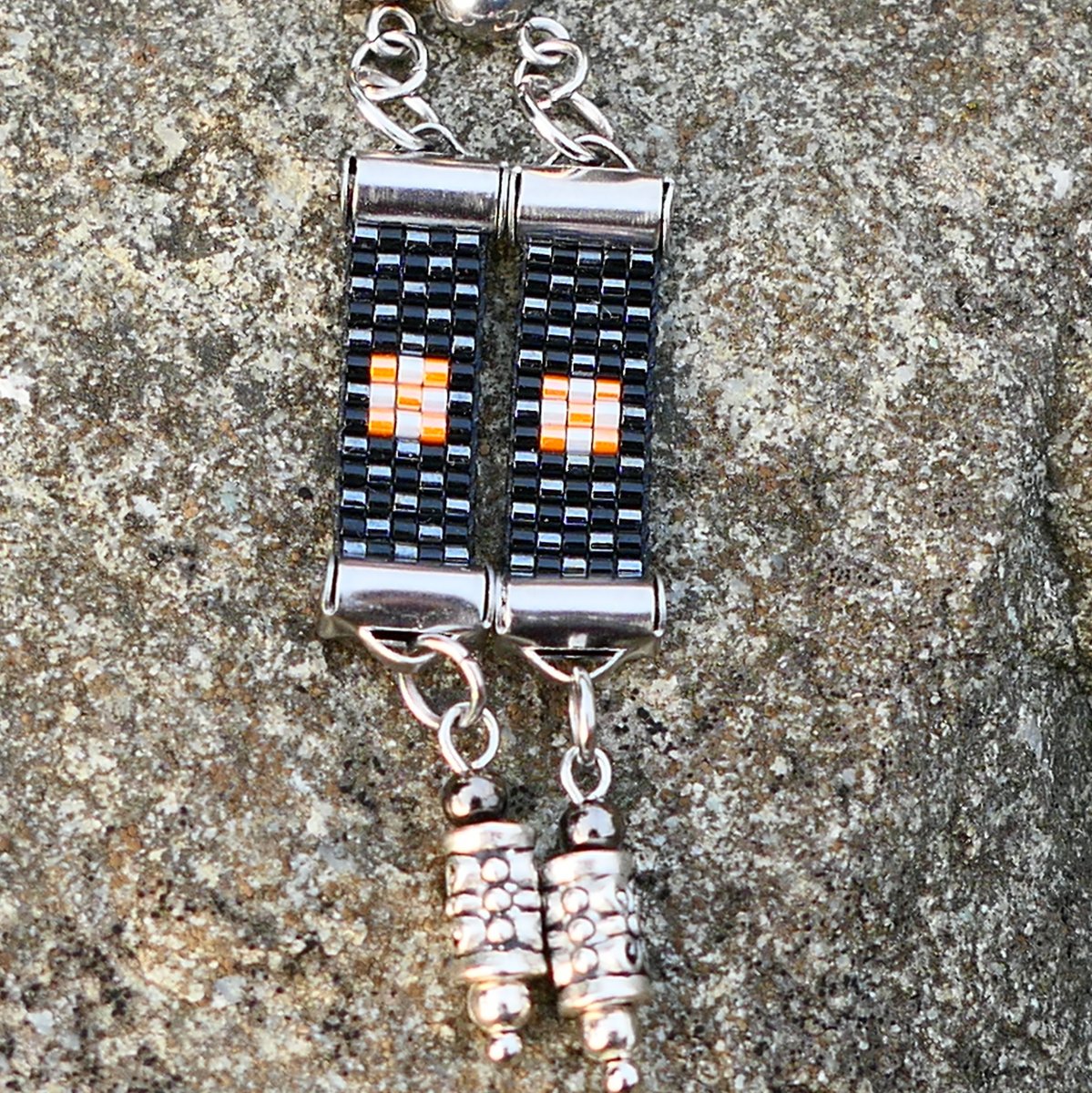 Ušito z japonského rokailu Miyuki nejmenší velikosti v barvě černé, antracit, bílá a oranžová. Doplněno kovovými kuličkami a válečky.