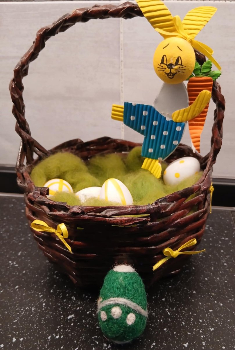 Vajíčko je uplstěno z rouna českých oveček, které jsme si nejprve několikrát vyprali, nabarvili, několikrát vyčesali a pak teprve mohlo vzniknout toto originální vajíčko, které má na zdobení po celém obvodu