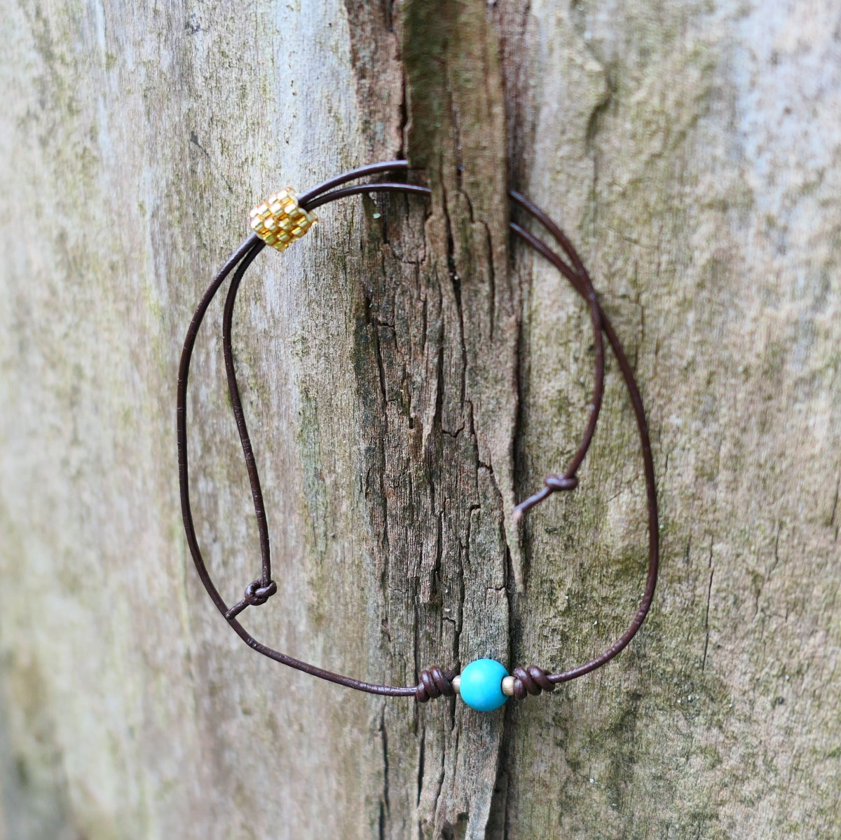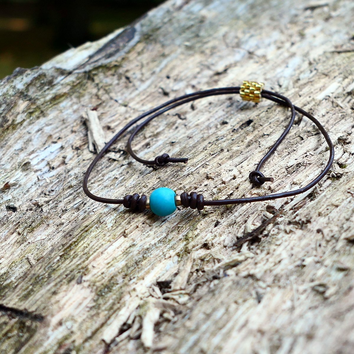 Decentní náramek s tyrkenitem a se dvěma drobnými kovovými distančními korálky ve zlaté barvě. Lehoučký, stahování na šitý zlatý korálek z japonských korálků.
