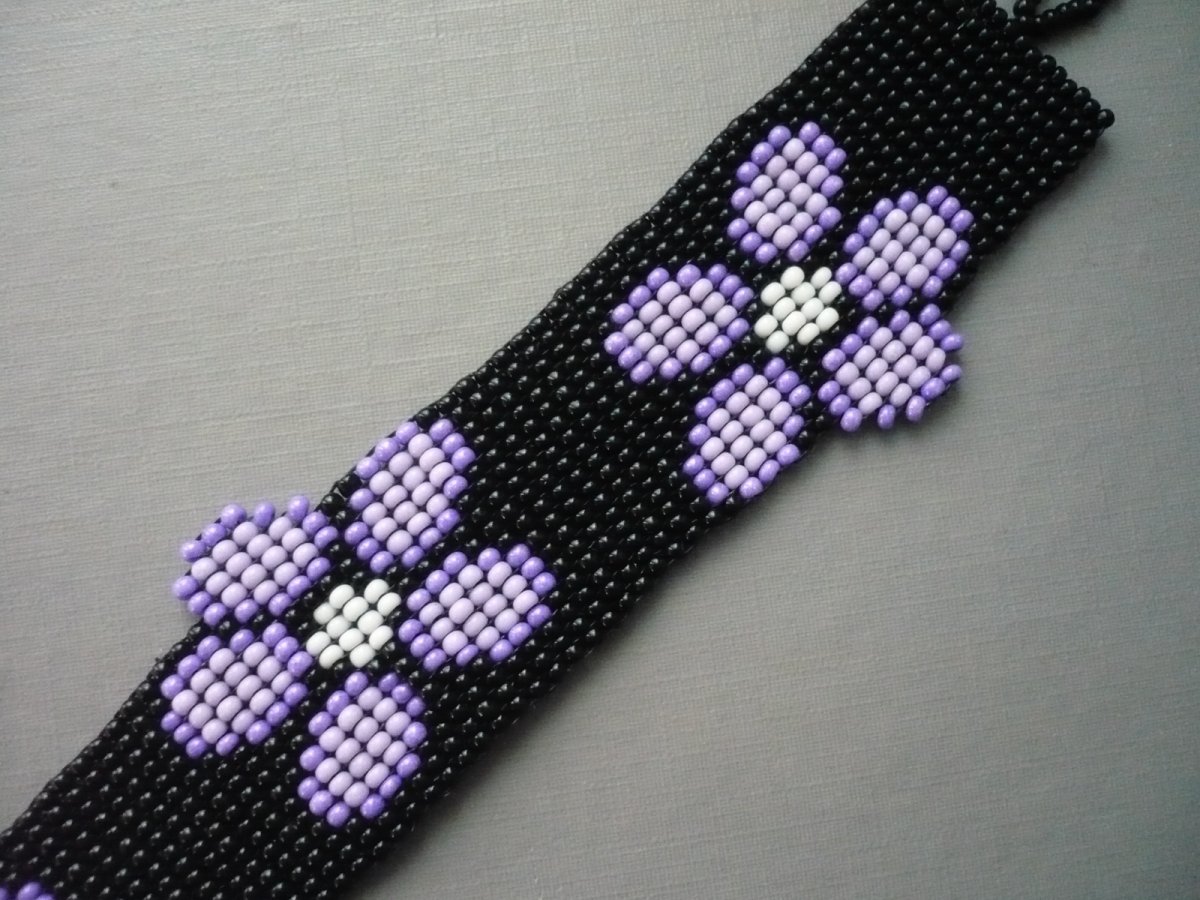 Luxusní ručně šitý náramek z rokajlových korálků. Šířka v nejširším místě 3 cm, délka na ruku max. 17,7 cm. Zapínání na kuličku a očko. Náramek je pevný, zapínání šito vlascem. Lze vyrobit na přání v různých délkách a barvách, ozvěte se vnitřní poštou!