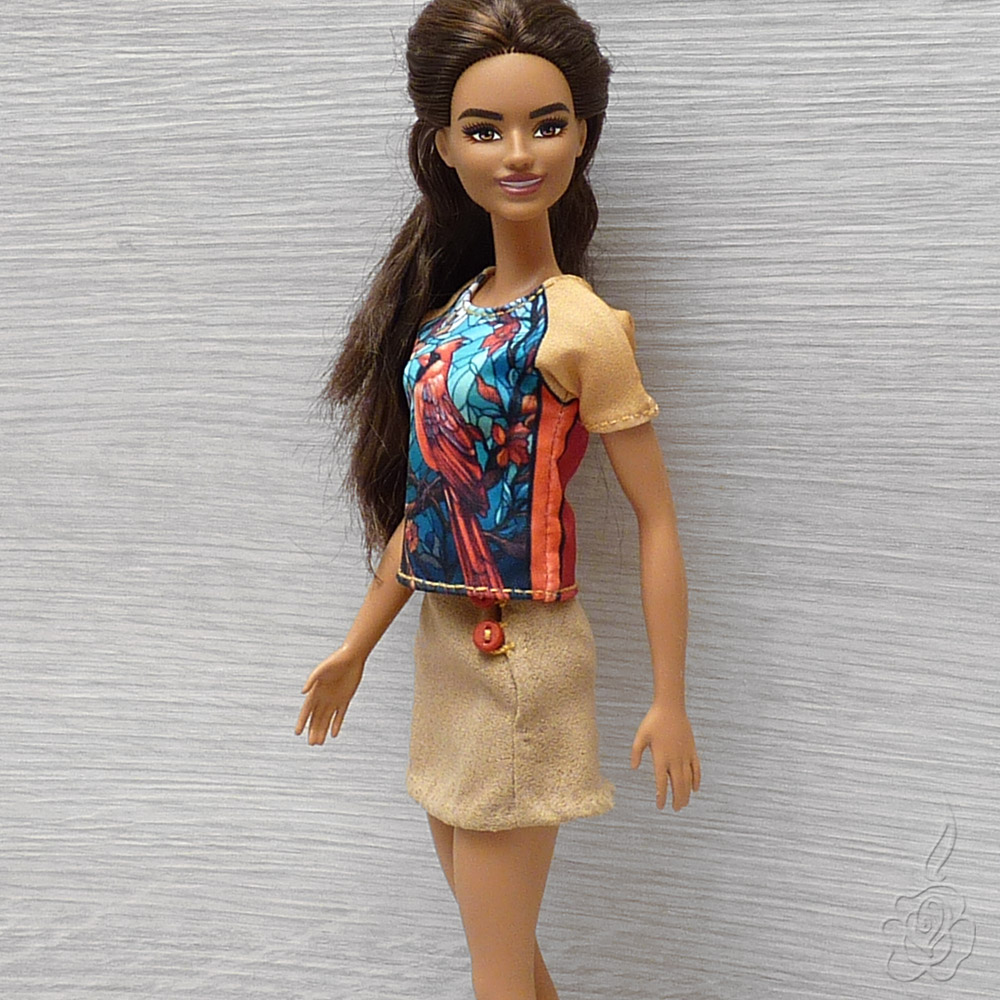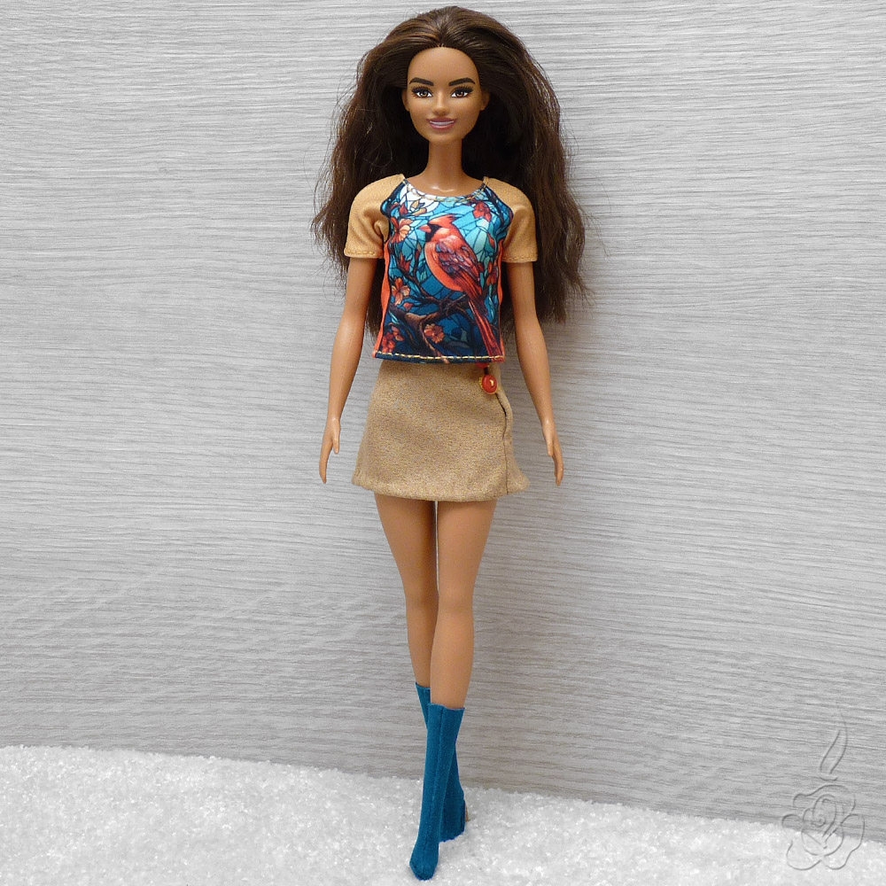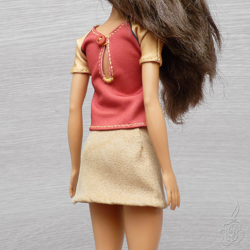 Barevné tričko a minisukně s knoflíčky pro panenku Barbie.