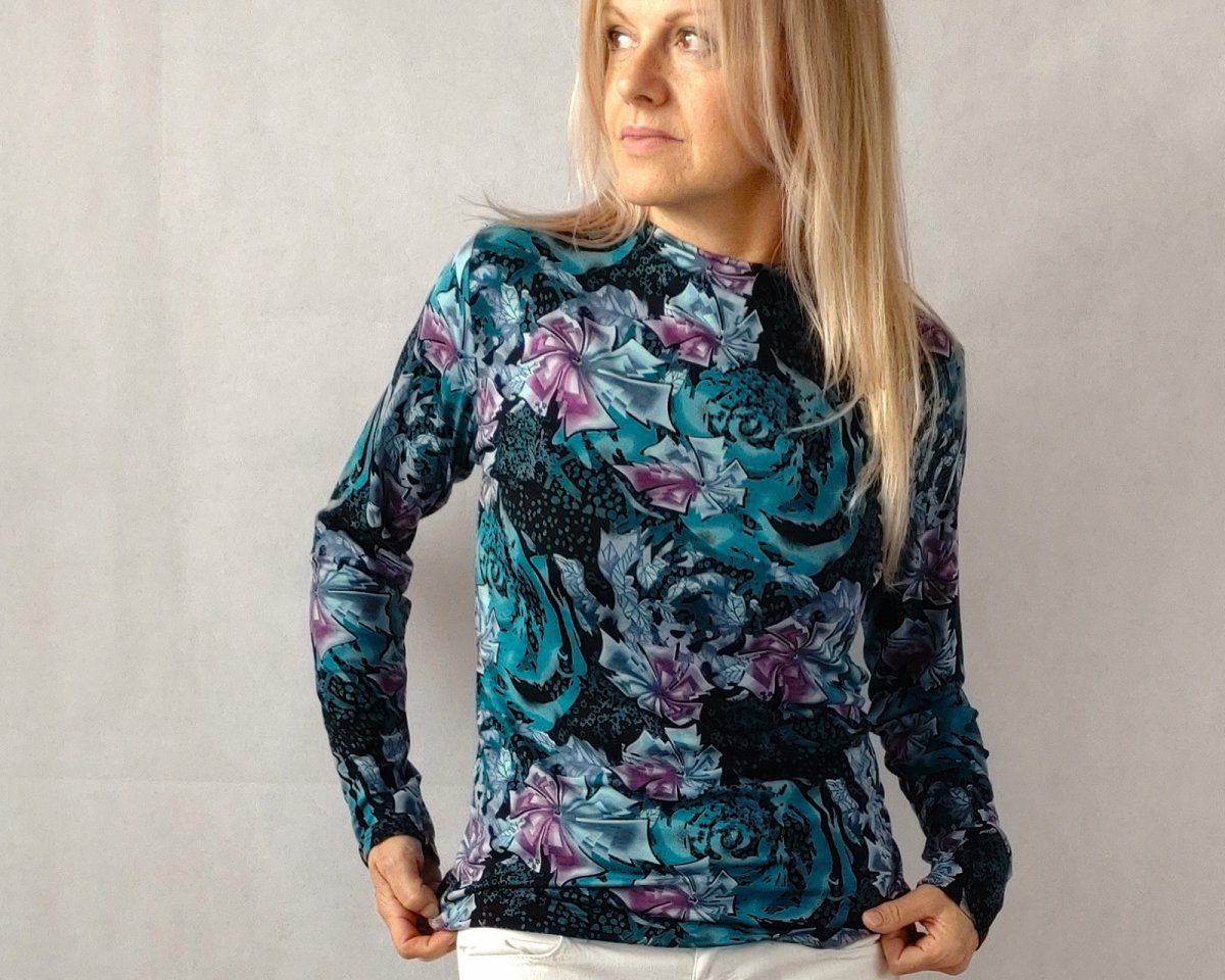 Jednoduchá elegance s rovným výstřihem ke krku a dlouhým rukávem.