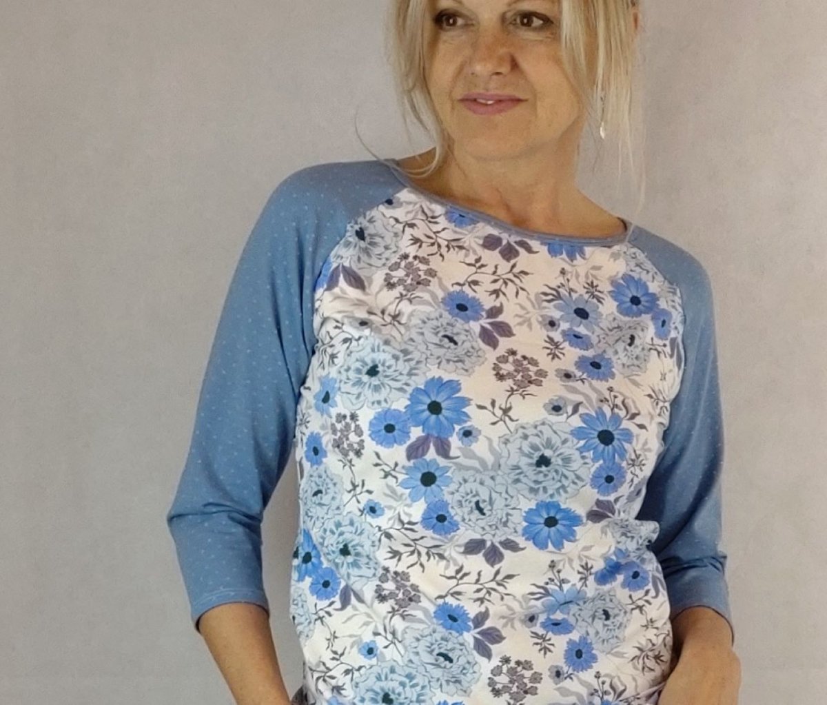 Raglánové tričko z elastického úpletu ve složení bavlna s lycrou. Kombinace vzájemně ladících potisků.