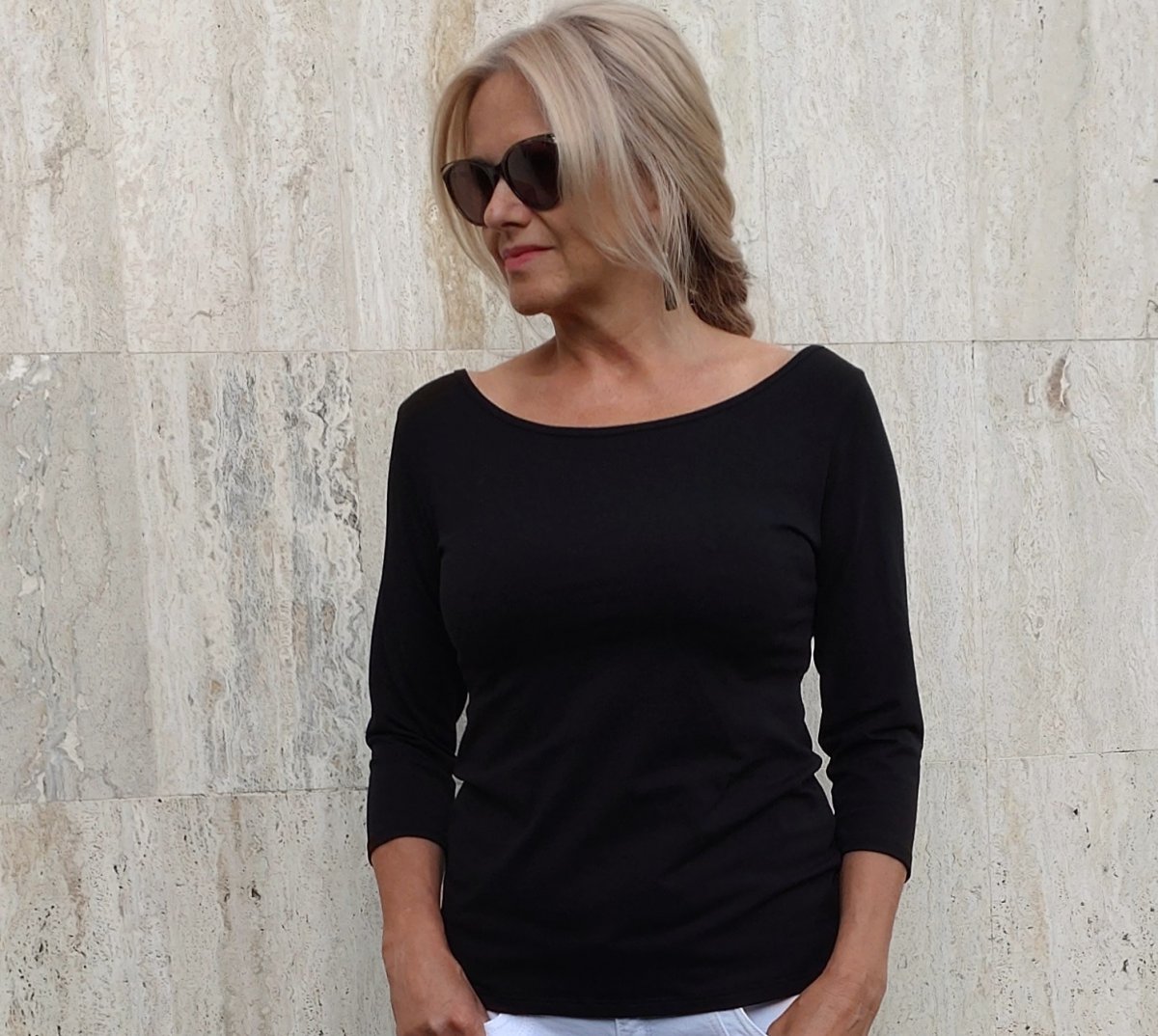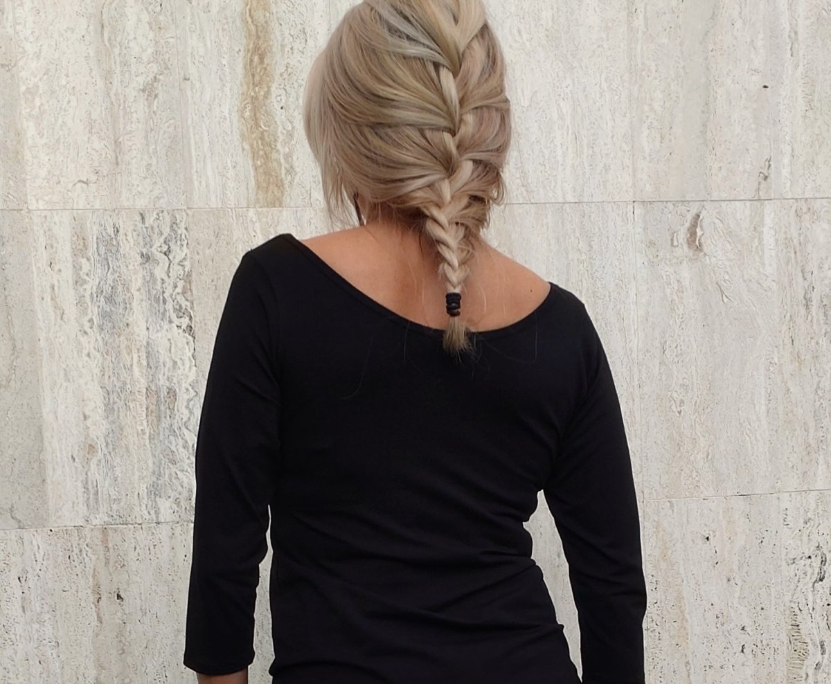 Hluboký a široký lodičkový výstřih, zadní výstřih hlubší.