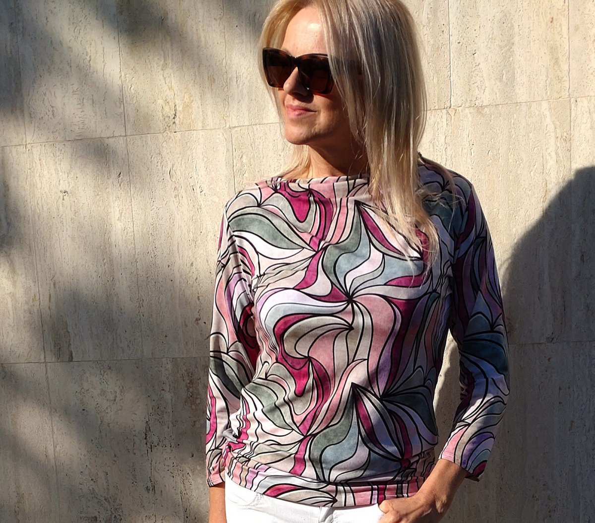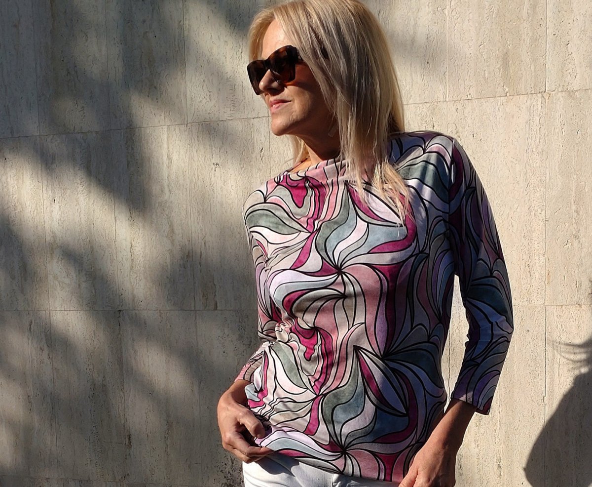 Jednoduchá elegance se založeným lodičkovým výstřihem a 3/4 rukávem.