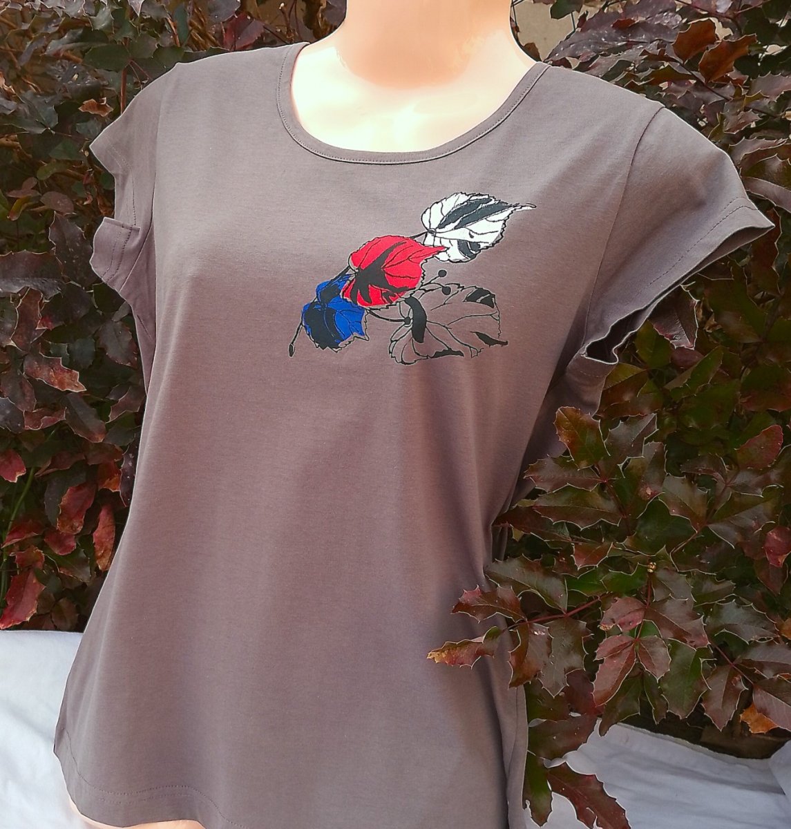 Bavlněné tričko značky Malfiny(Adler) s originálním ručním potiskem lipové větvičky v českých národních barvách.