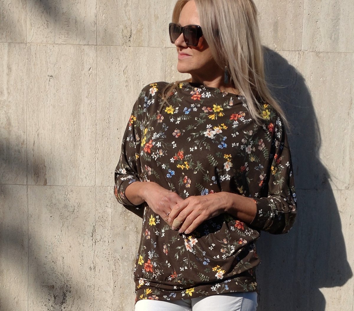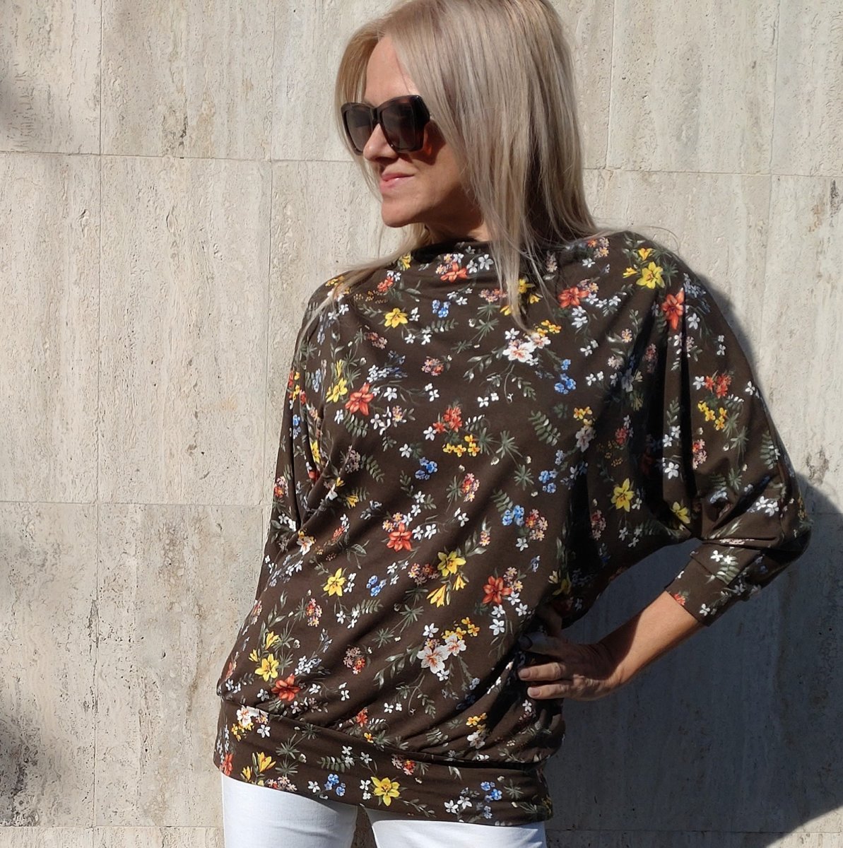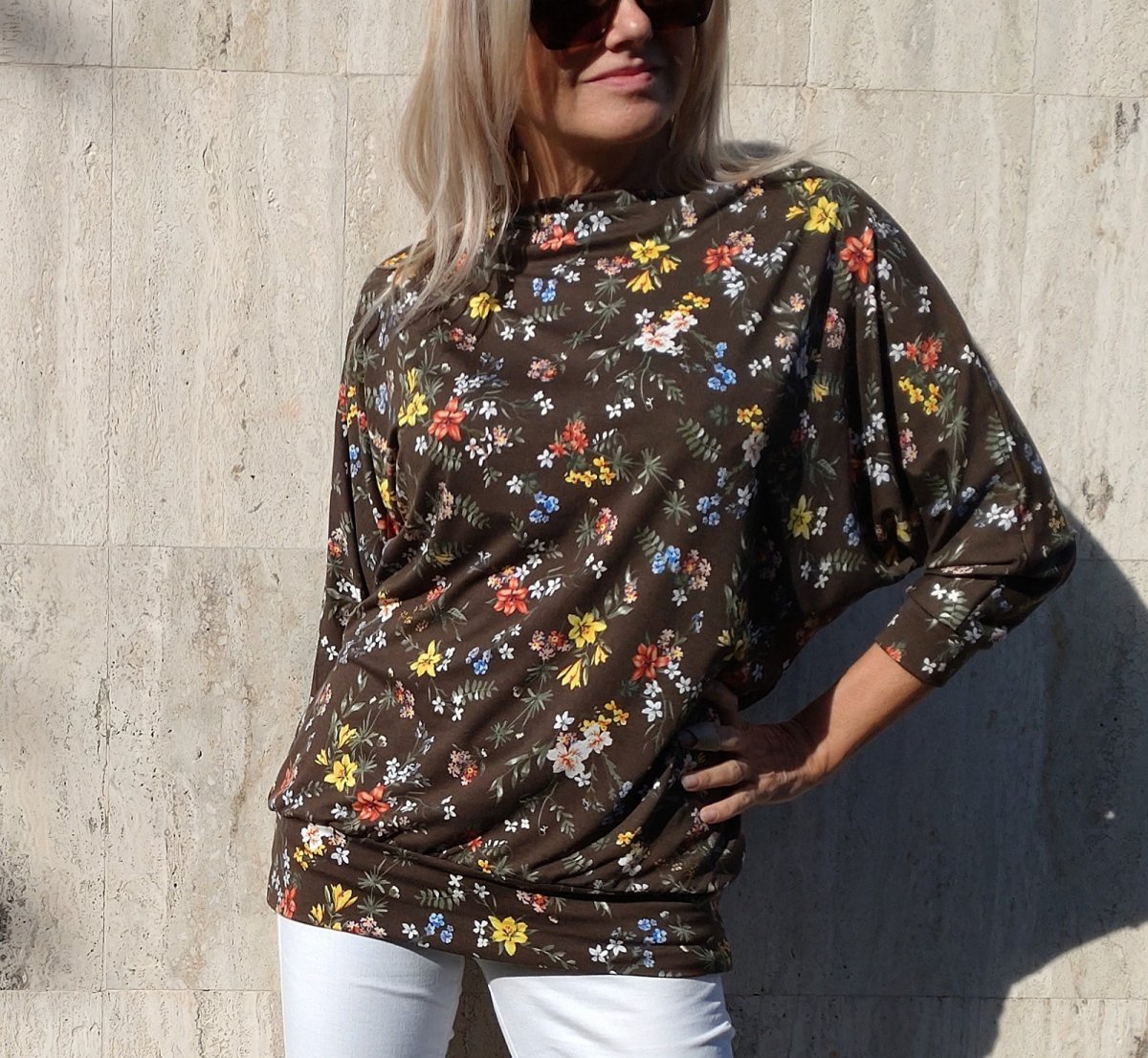 Rovný lodičkový výstřih ke krku, pohodlný střih kryjící nedostatky postavy. Spodní lem dvojitý, pružný.