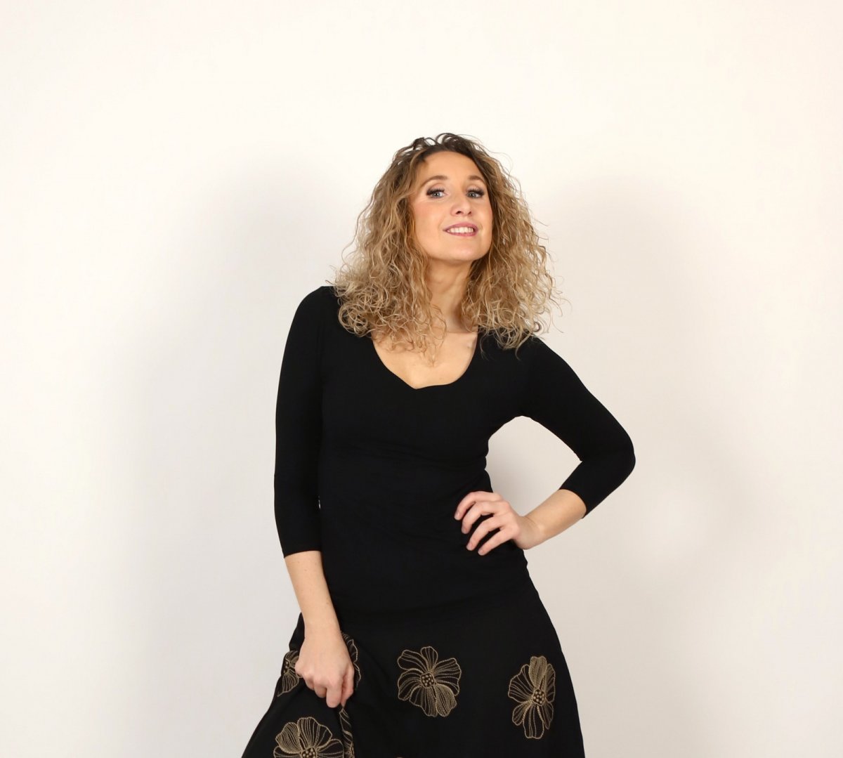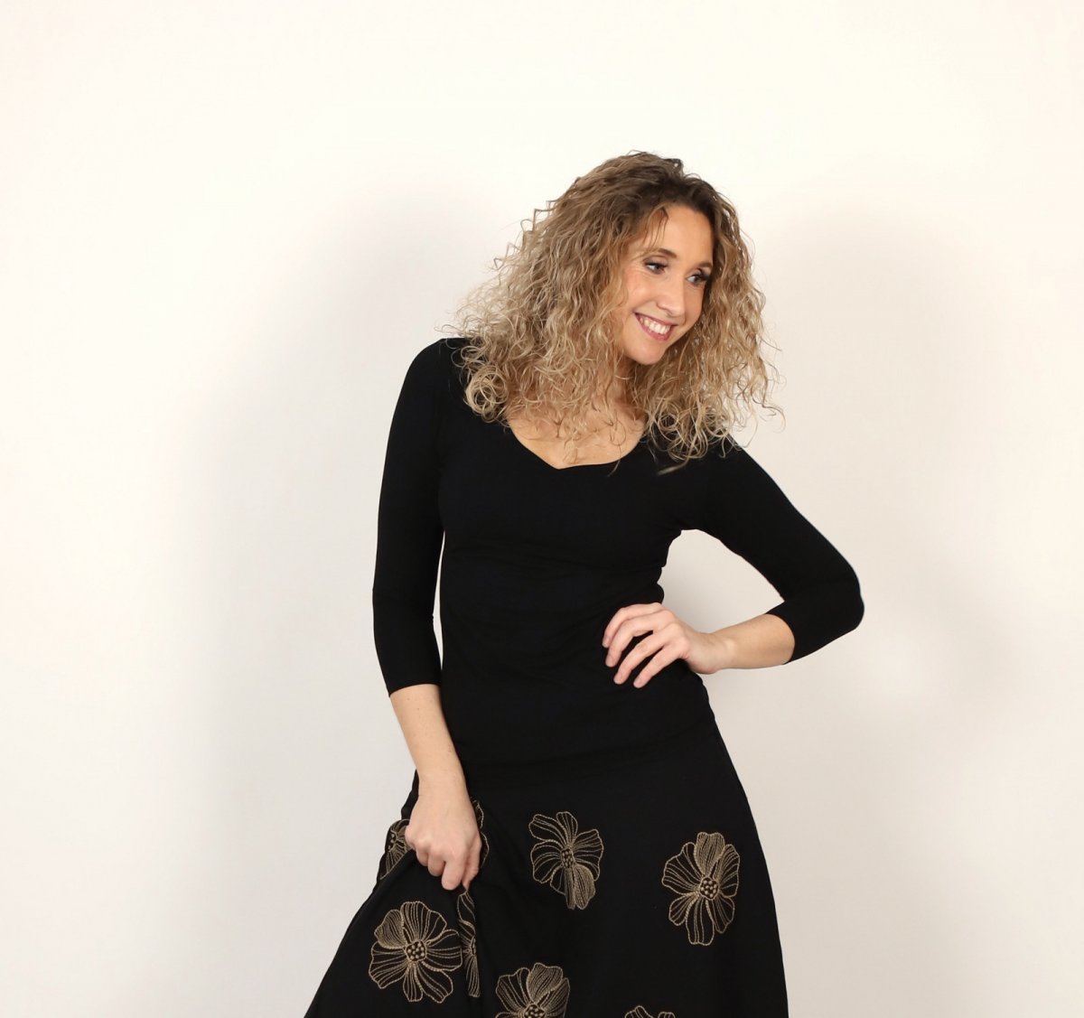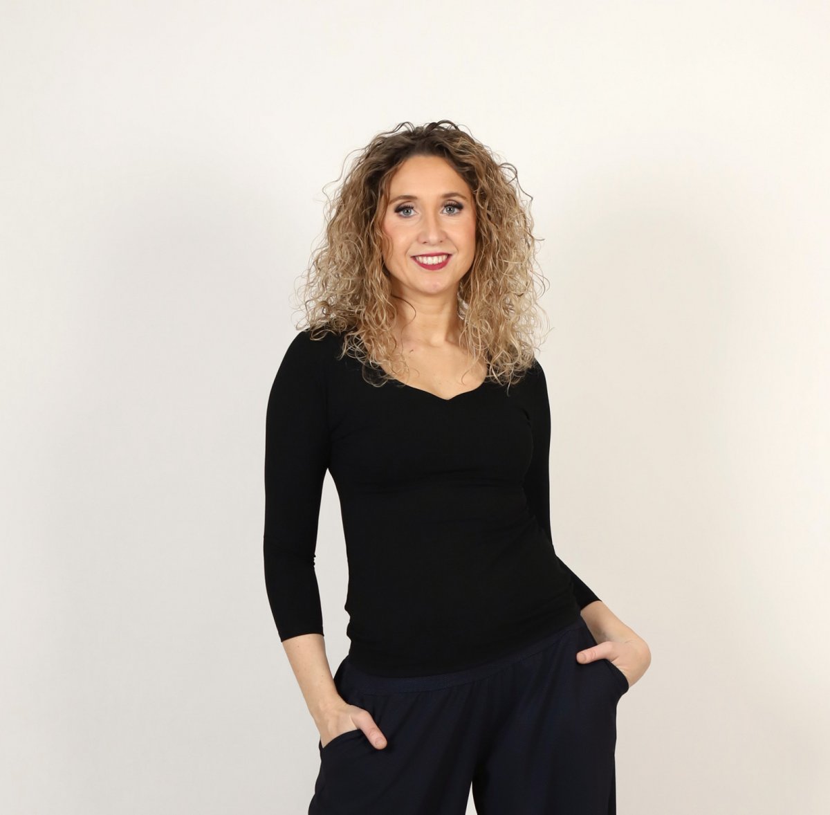 Tričko s vykrojeným výstřihem je ušité z příjemného materiálu viskóza/elastan. Přední díl je zdvojený a rukávy mají 3/4 délku.