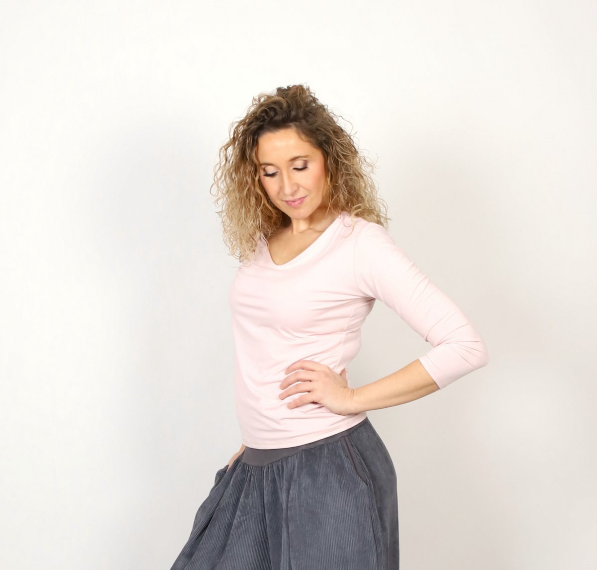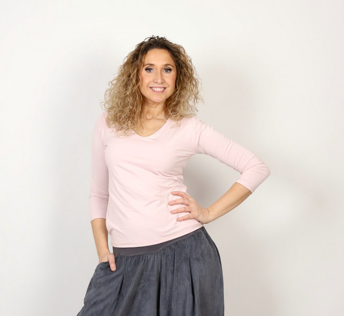 Tričko s výstřihem do V je ušité z příjemného materiálu viskóza/elastan. Přední díl je zdvojený a rukávy mají 3/4 délku.