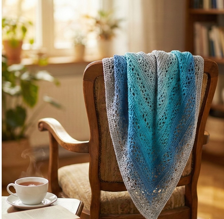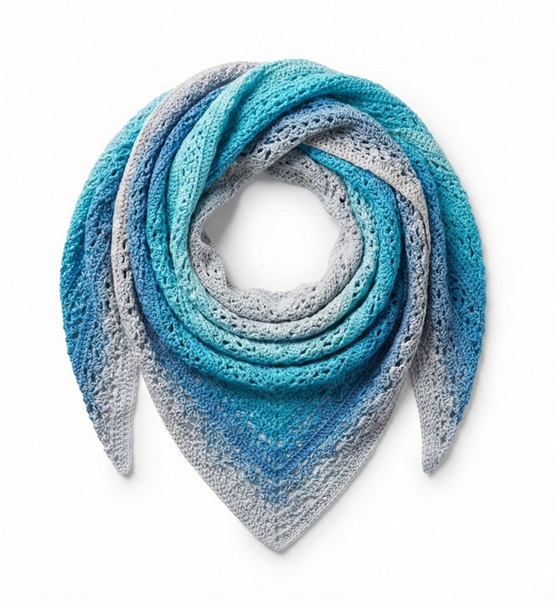 Háčkovaný šátek Poklad skřítků je výsledek tajného adventního háčkování TAS 2024. Šátek je háčkovaný podle návodu Míši Málkové. Klubíčko nese název V náručí zimy.