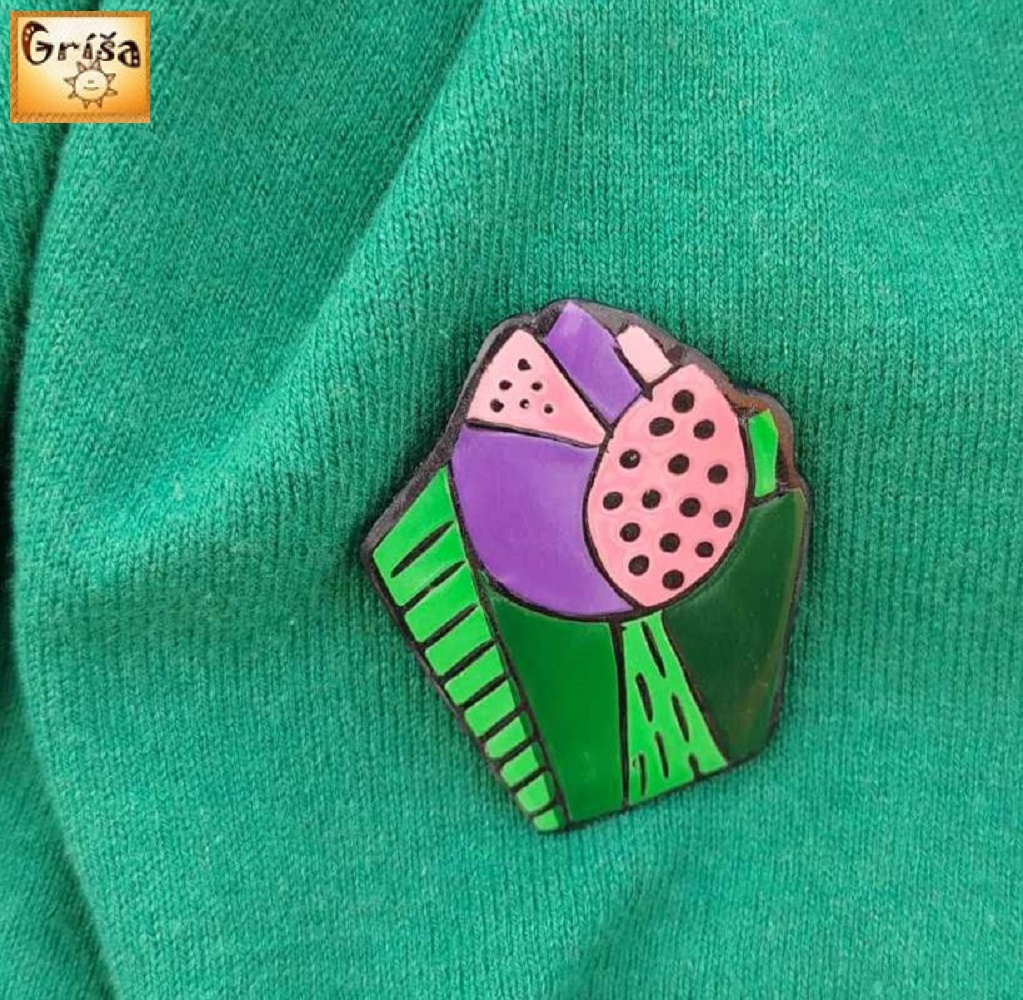 Rozměry autorské leštěné brože z polymerové hmoty jsou cca 43x56 mm.