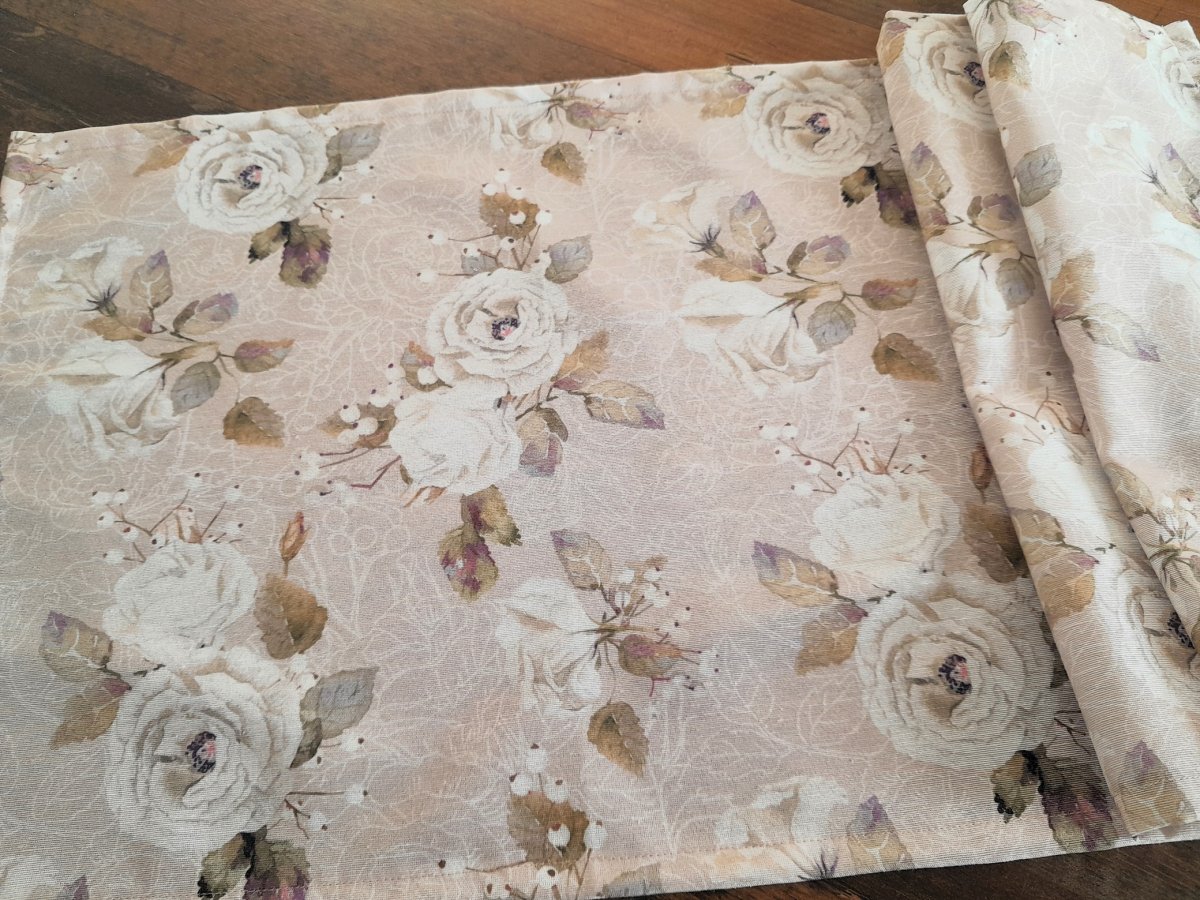 Nabízím středový ubrus, dečku šitou z béžové látky s bílou růží.