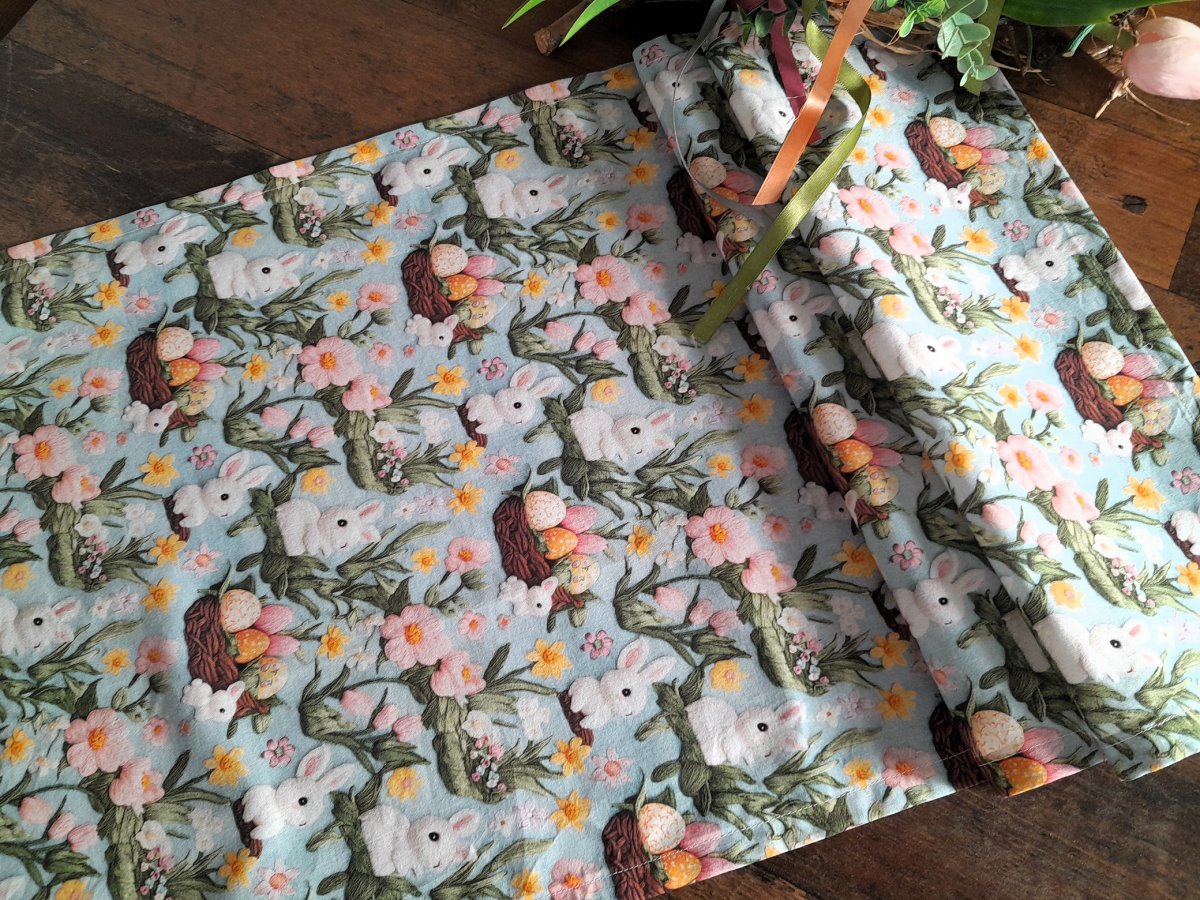 Nabízím středový ubrus, dečku šitou z veselé velikonoční látky se zajíčky a malovanými vajíčky na světle šedo-modrém podkladě..