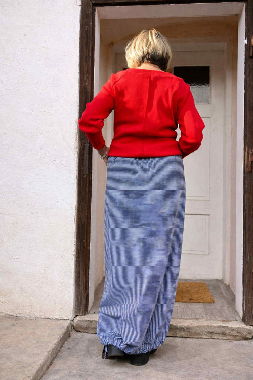 Ušitá z upletu s proužkem v modrobílé barevnosti. Sukně má kapsy.