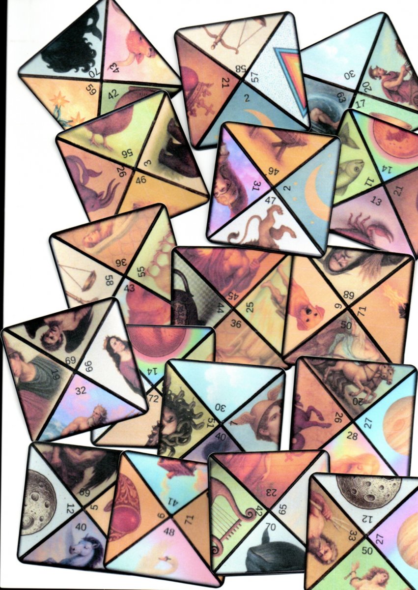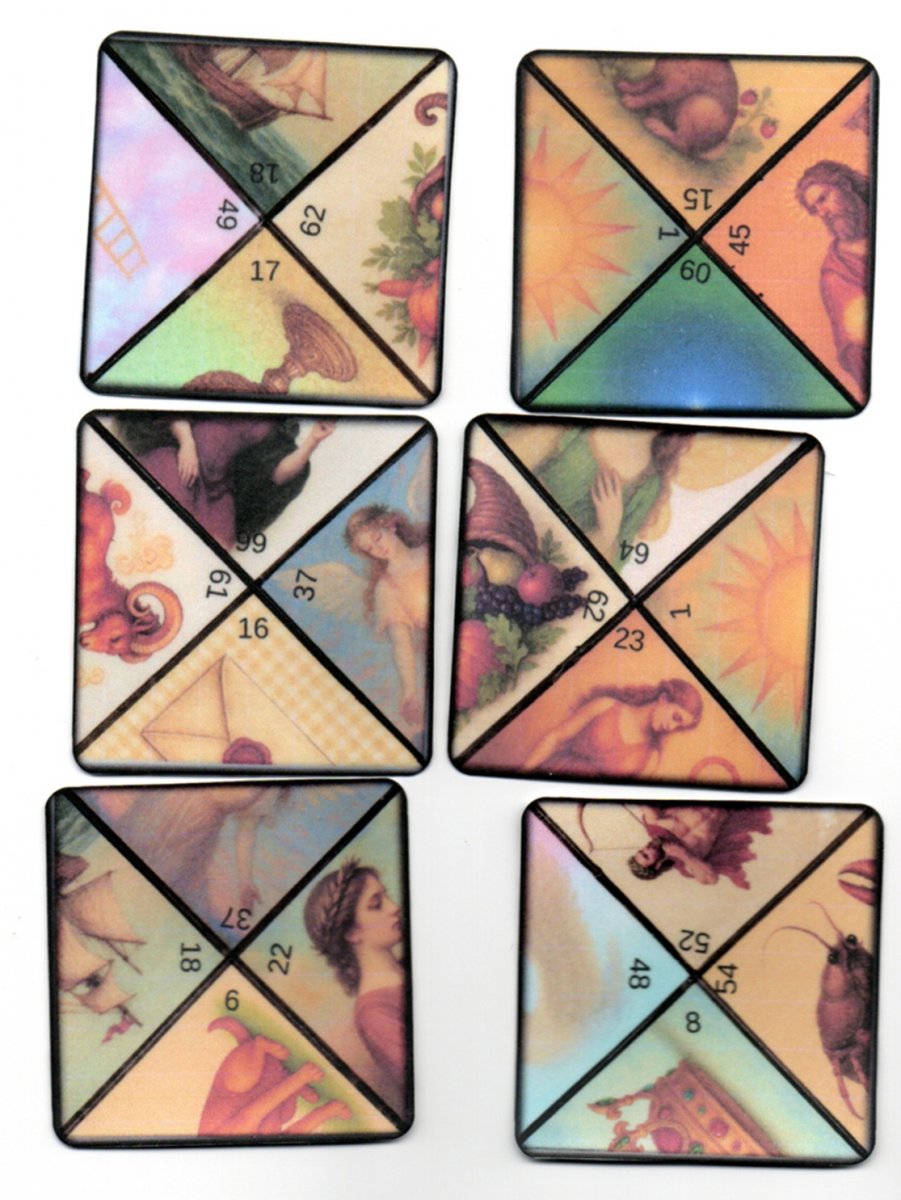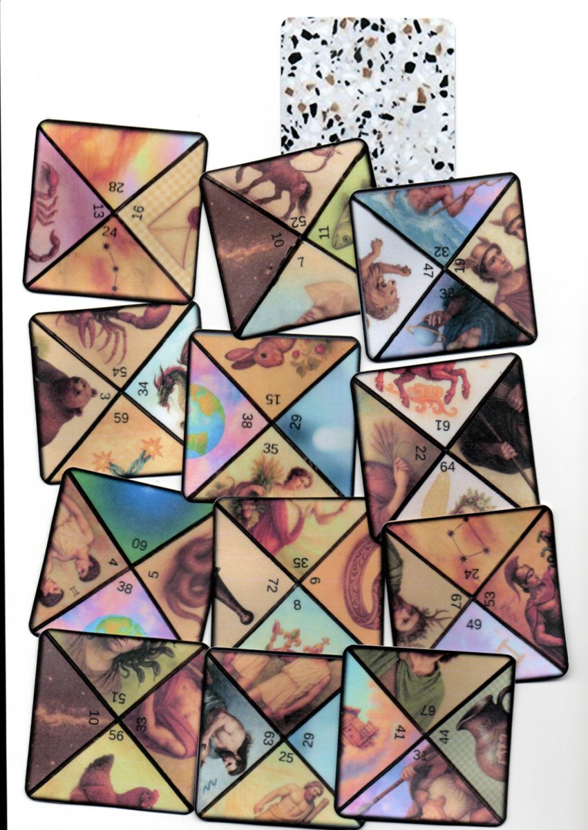 vykládací karty nově vytvořený podle karet od Valdštejnova astrologa Giovanniho Battisty Seniho 1600-1656, 36ks karet 6,2x6,2cm tisk na papír 250g . přikládám tištěný návod a význam ,vydán v roce 1999 v časopise květy,
