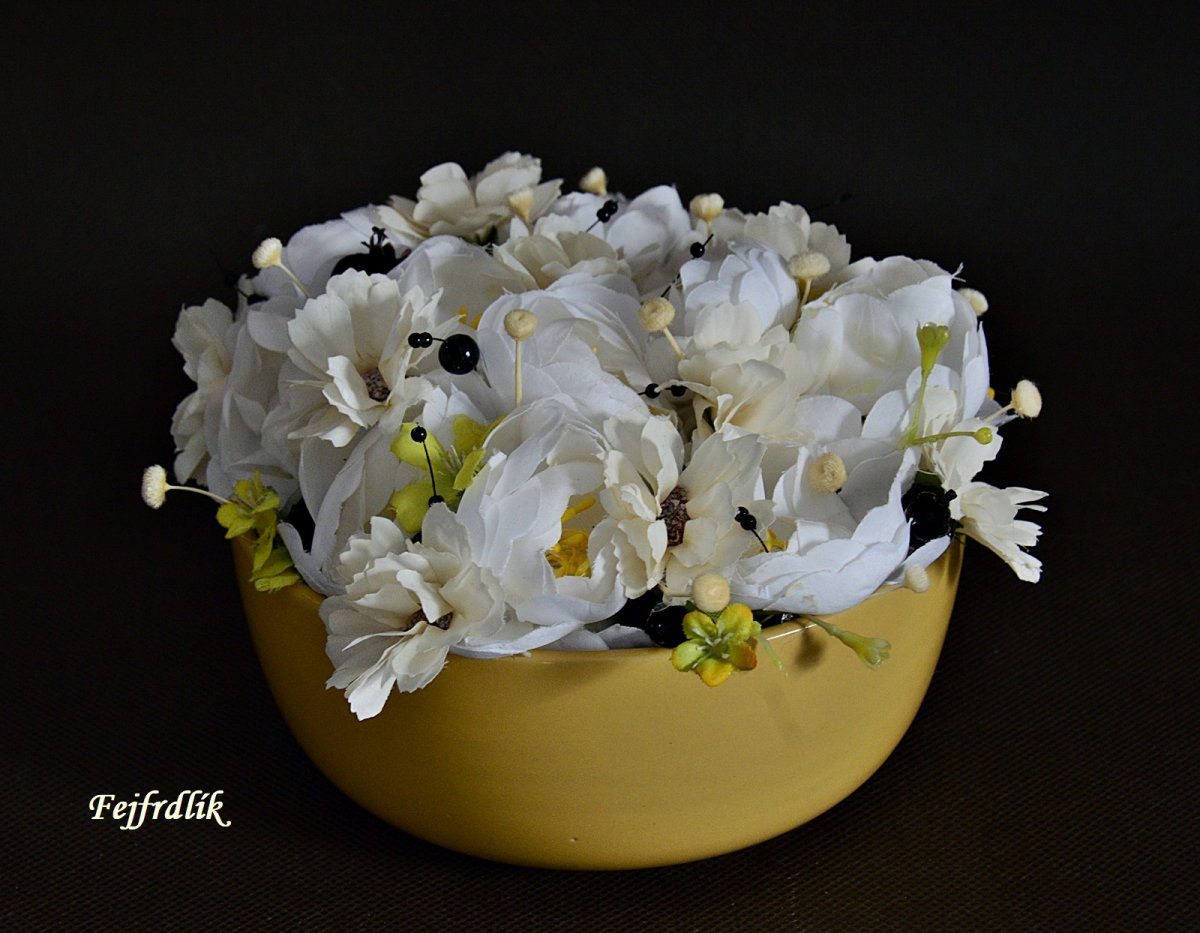 Květinové aranžmá s umělými a látkovými květinami, bobulkami a korálky v keramické misce.