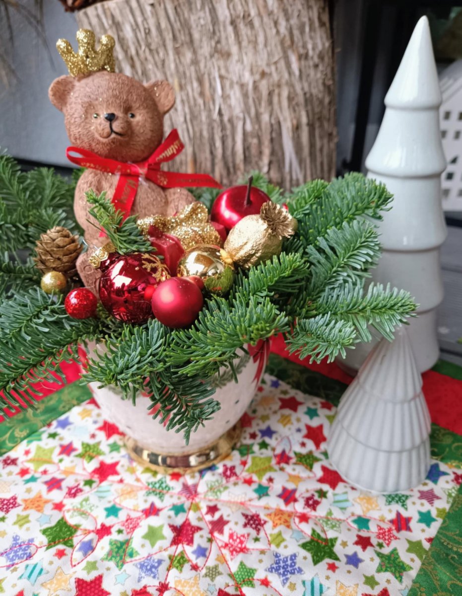 Nabízím originální vánoční aranžmá v hrníčku s ouškem, zdobené čerstvou jedlovou zelení a výraznými červenými a zlatými ozdobami. Dominantou dekorace je roztomilý medvídek s třpytivou korunkou, který dodá celému aranžmá hravý, ale zároveň elegantní sváteční vzhled.