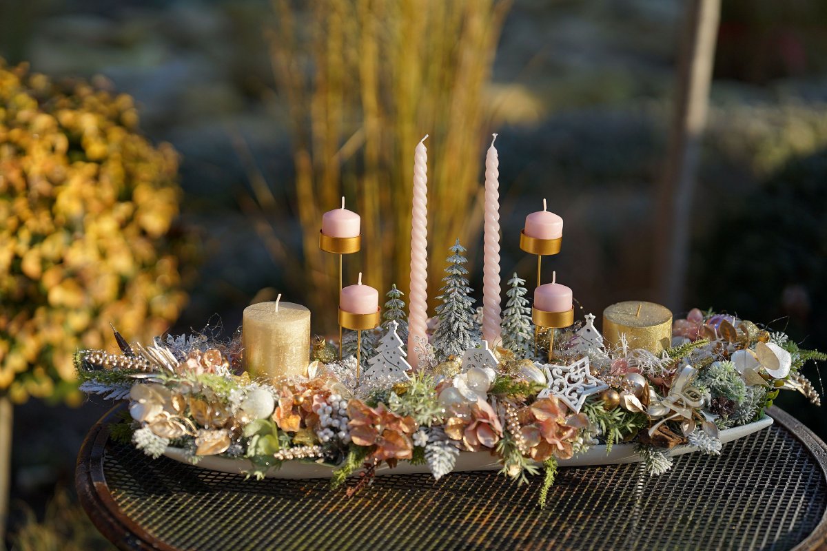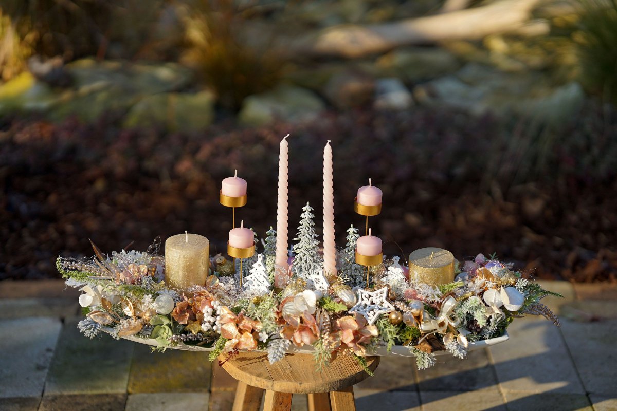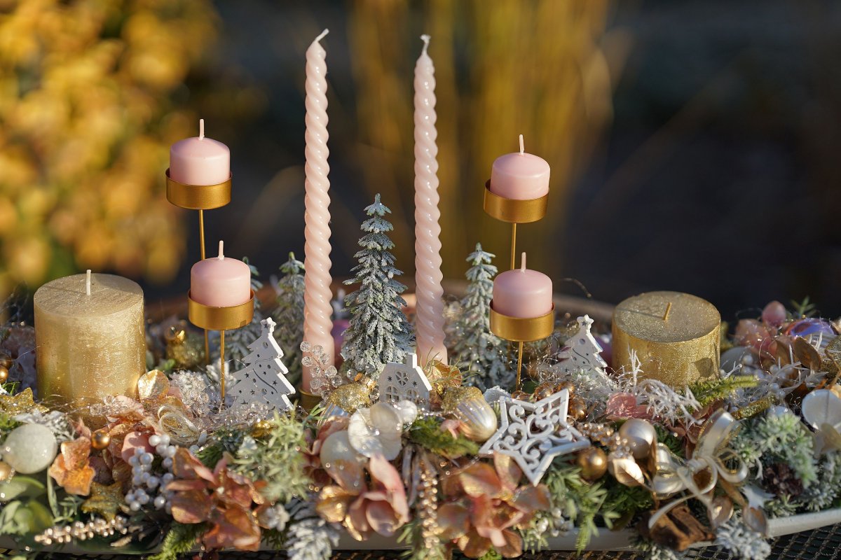 Dlouhý vánoční svícen v kombinaci růžové a zlaté barvy. Několik druhů svíček, umělé chvojí ve 3D kvalitě, krystalky, baňky, bobulky, zlacené listy.... Rozměr svícnu 78x30cm, výška po knot vysokých svíček je 34cm.
