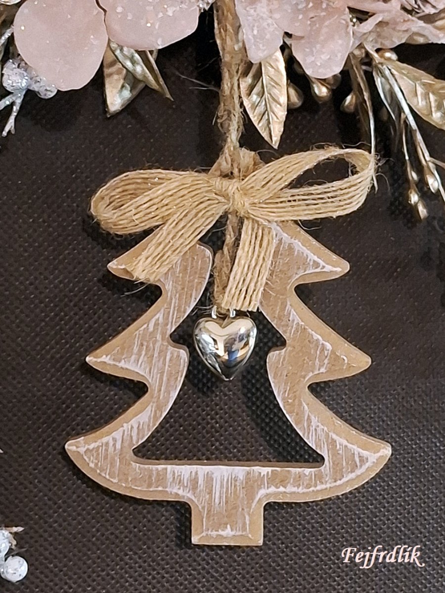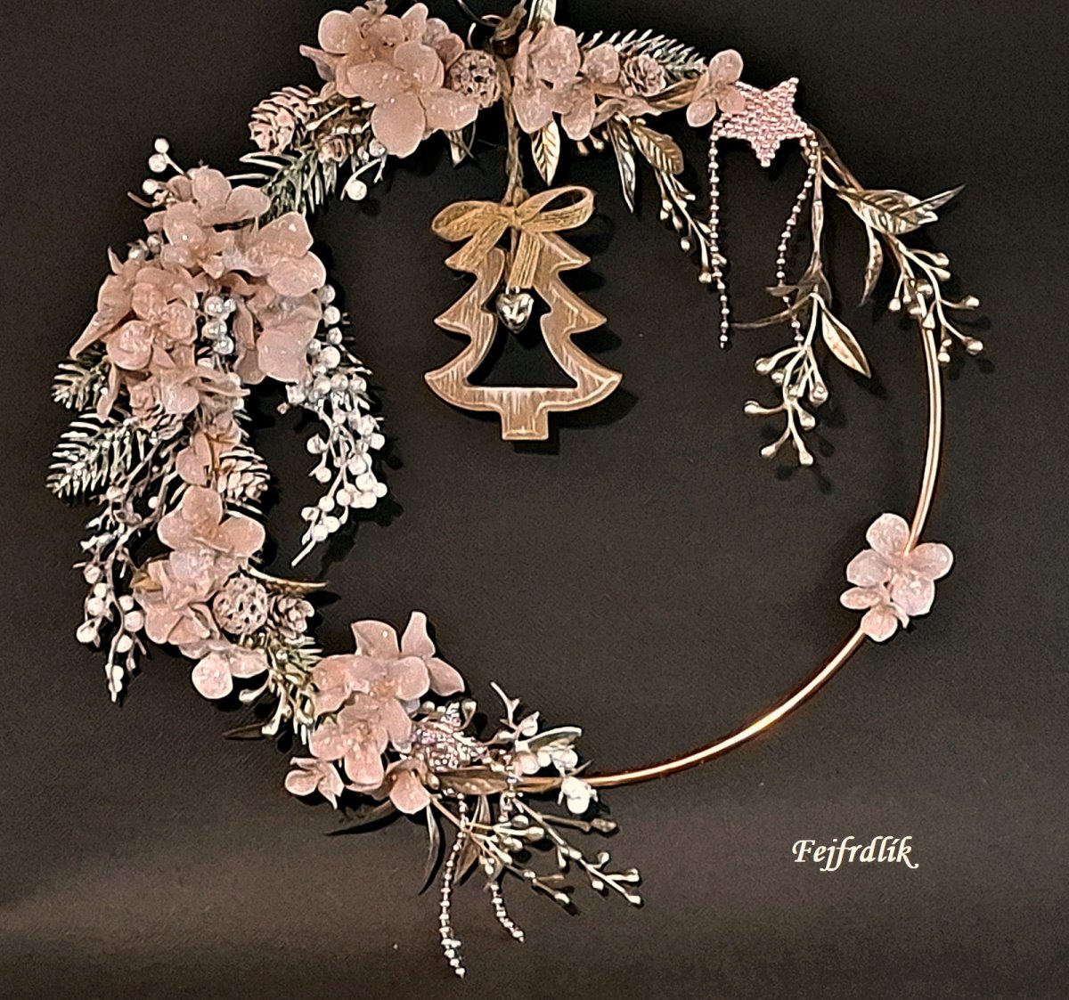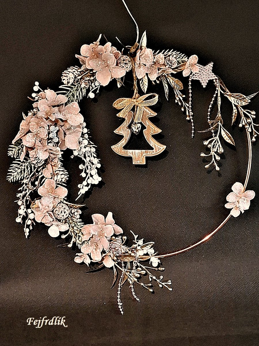 Originální vánoční věneček na kovovém kruhu se zavšeným dřevěným stromečkem s ozdobou, umělými zasněženými hortenziemi a ostat.přízdobami.