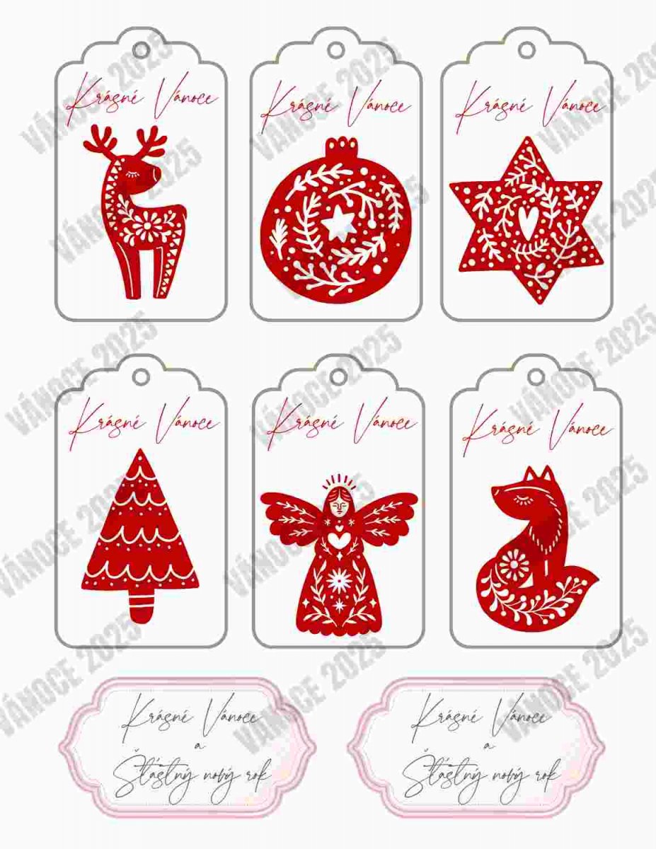 Stačí vytisknout (doporučeno na tvrdší papír), udělat děrovačkou otvory pro provázek a ihned použít na vánoční dárky.