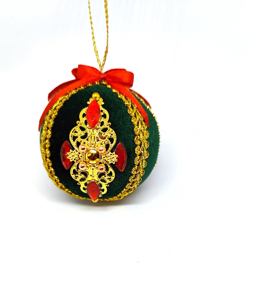 Použitý materiál :zelený samet, červené kamínky ,zlaté brože ,zlaté krajky a mašle .