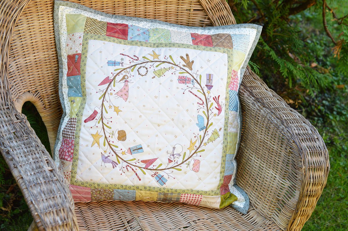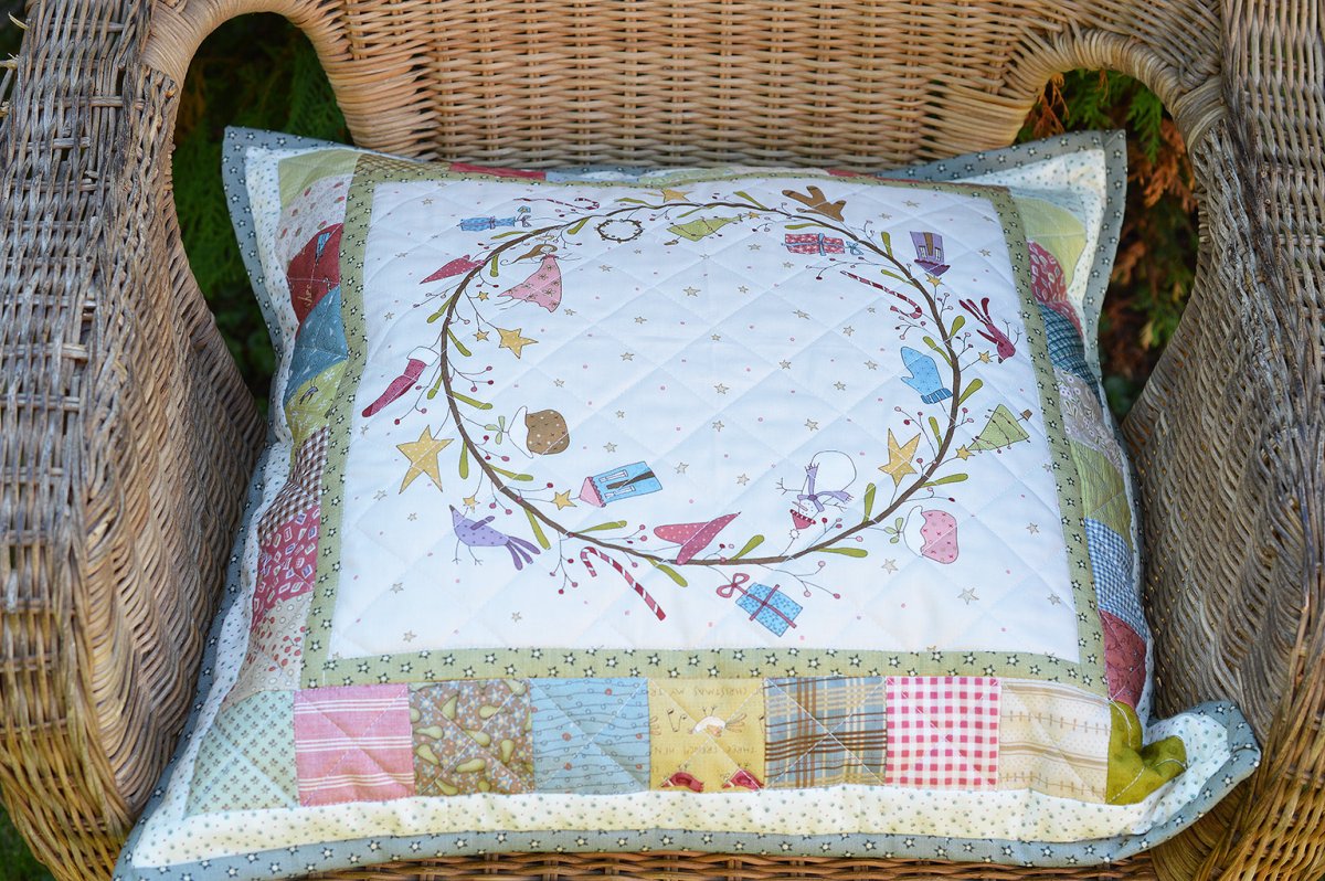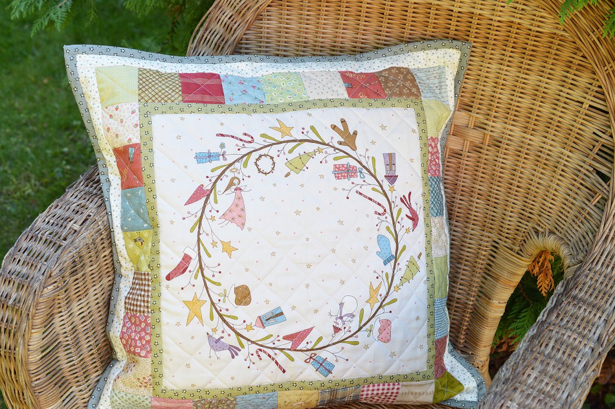 Střed tvoří tištěný panel s motivem vánočního věnečku, doplněný o pečlivě sladěný lem, složený z bavlněných čtverců v přírodních a pastelových tónech.