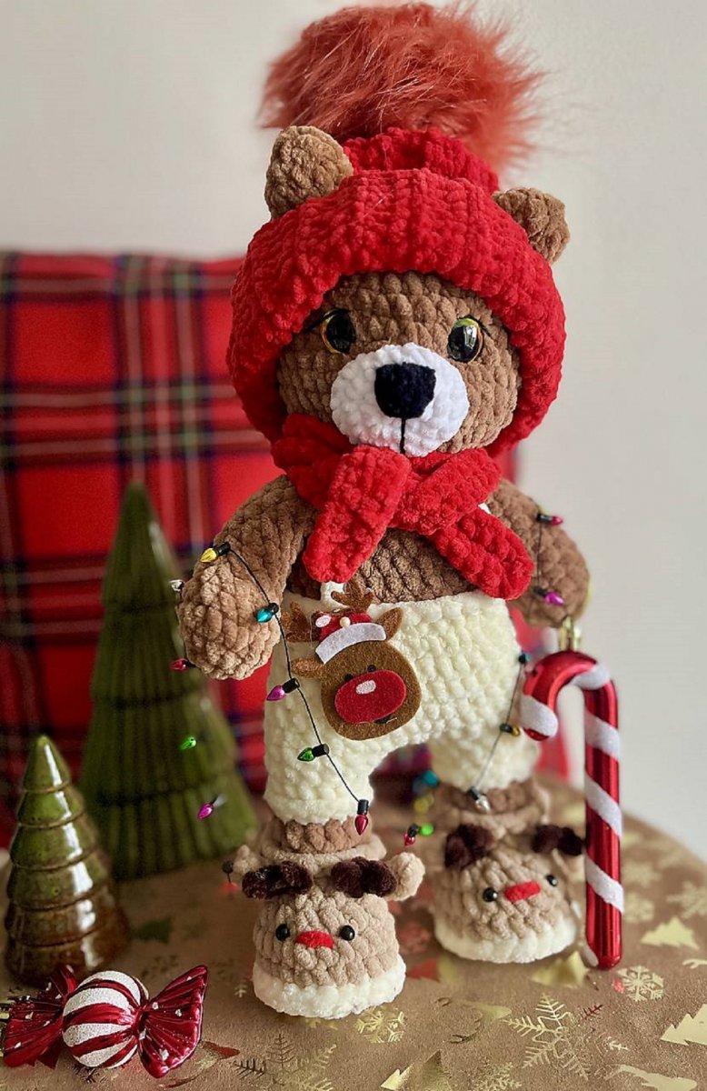 Nosí červenou zimní čepici s bambulí, hřejivou šálu a krémové kalhoty se sobí aplikací. Na nožkách má roztomilé sobí bačkůrky, které každého okouzlí. V tlapce drží cukrovou hůlku, která k Vánocům prostě patří.
