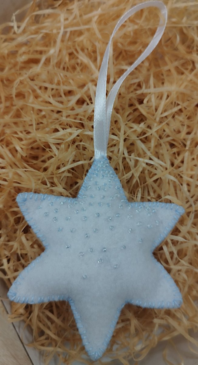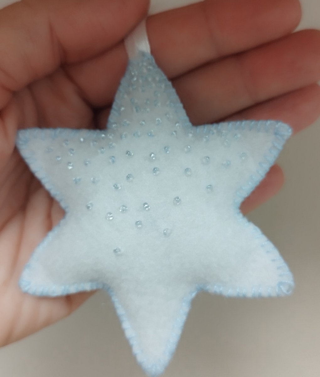 Vánoční hvězdička, bílá se světle modrým zdobením, ručně šitá z filcu, ozdobena perličkami