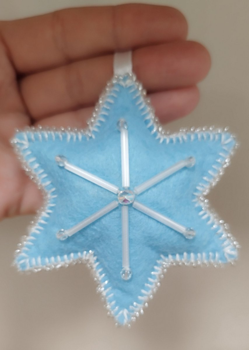 Vánoční hvězdička, světle modrá s bílostříbrným zdobením, ručně šitá z filcu, ozdobena perličkami