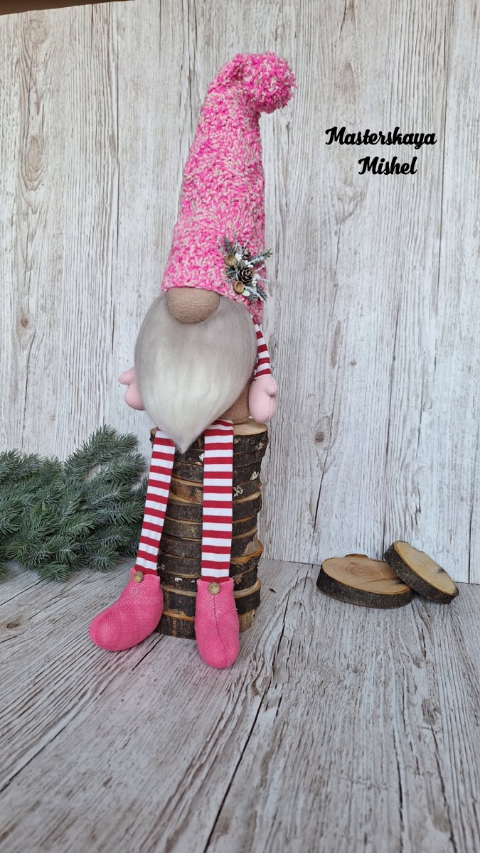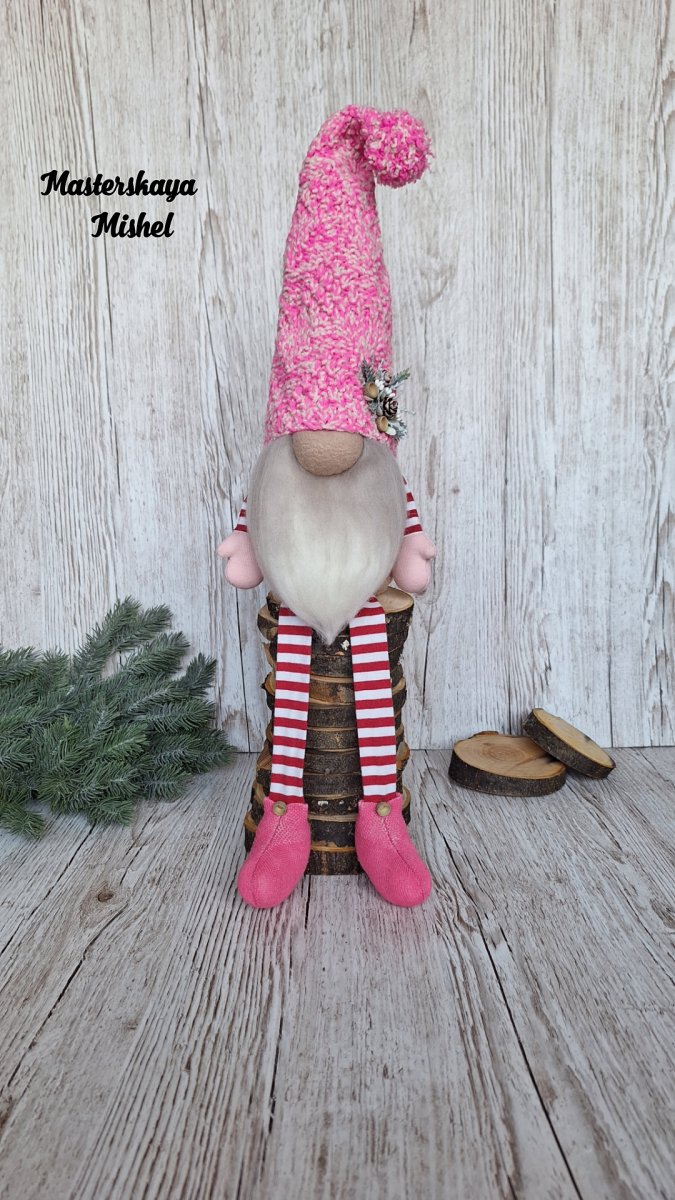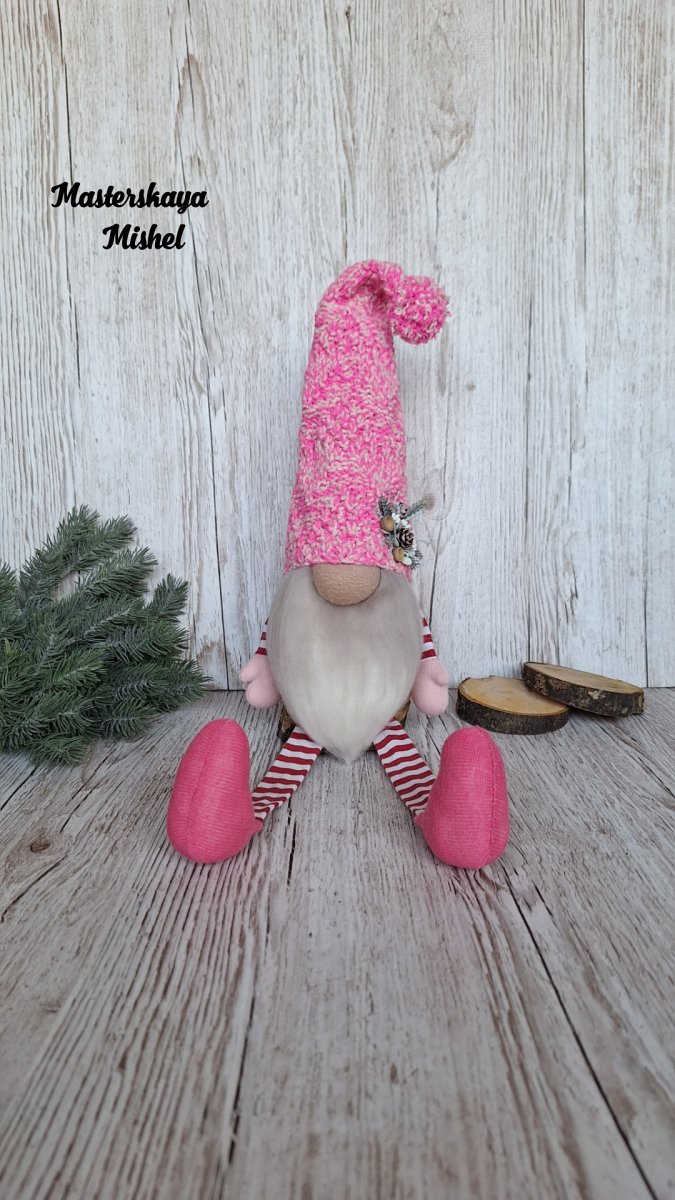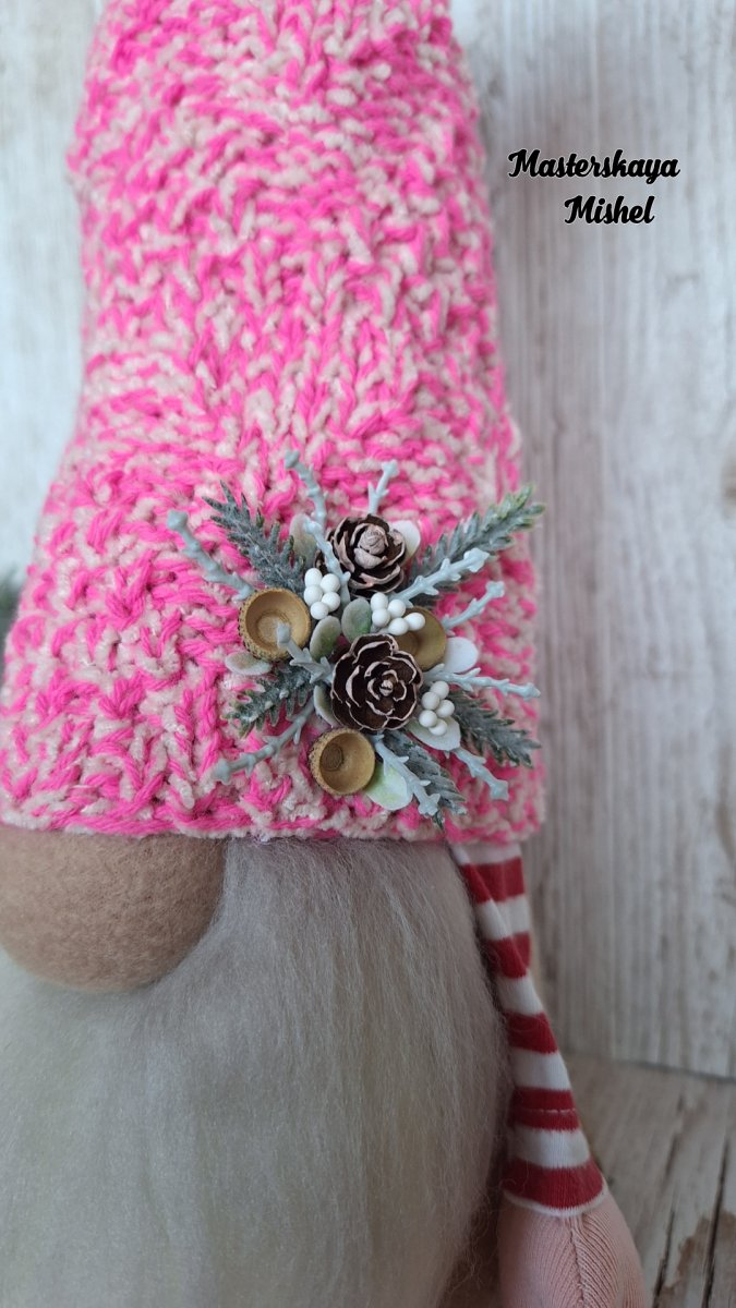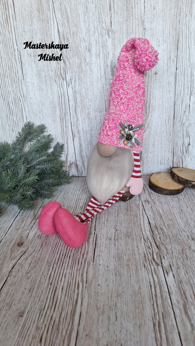 Skandinávský vánoční gnome v růžové pletené čepici s visícíma nožičkami.