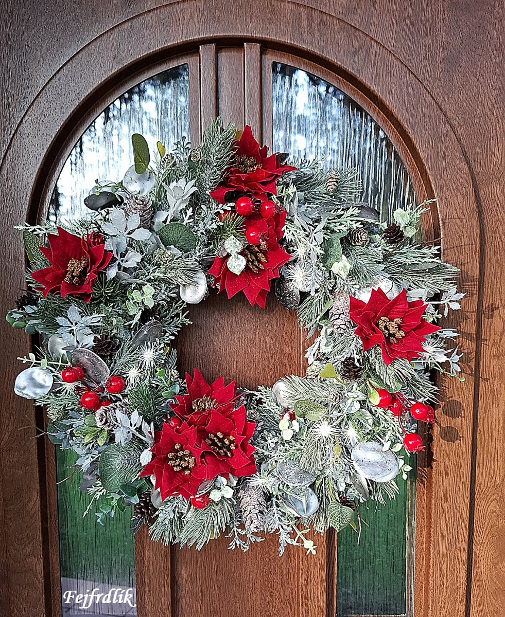 Vánoční věnec z trvanlivých umělých materiálů , vázaný na slaměný korpus obalený stužkami s očkem na zavěšení. Doplněno o šišky a červené vánoční umělé květy.