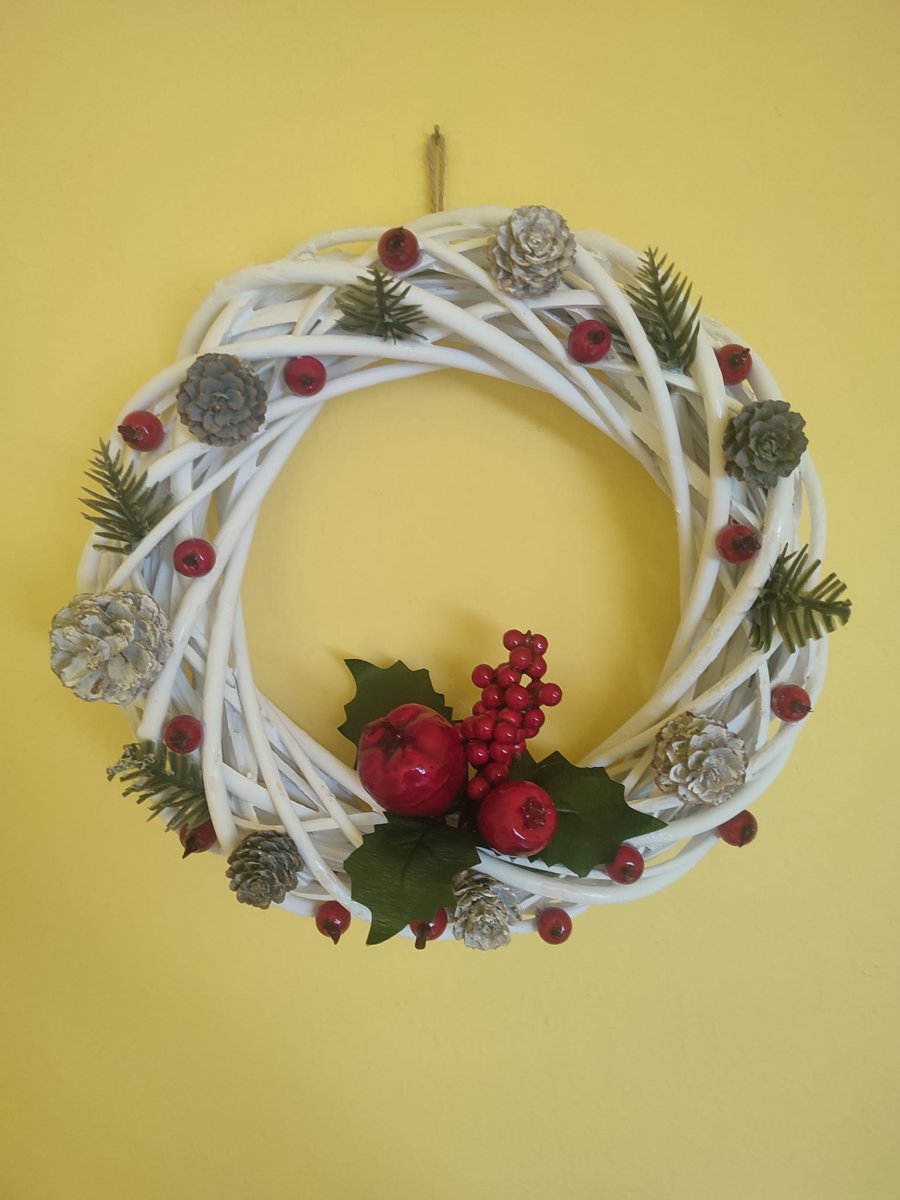Věnec s jablky dozdoběný větvičkami, jeřabinami a šiškami.