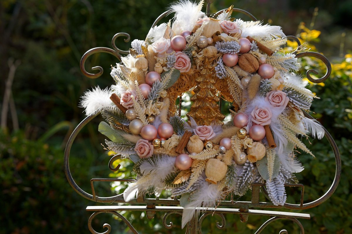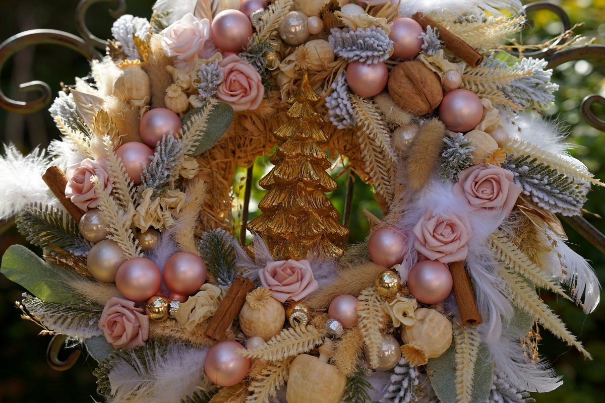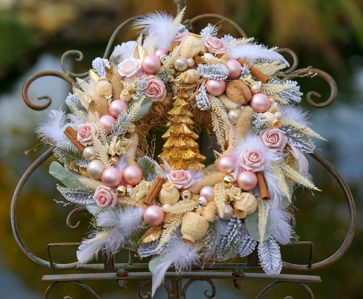 Vánoční věnec ve zlaté, růžové, smetanové a zelené barvě. Přírodní materiály, baňky, chvojí, stromek... to vše tvoří tento věnec o průměru 33cm.
