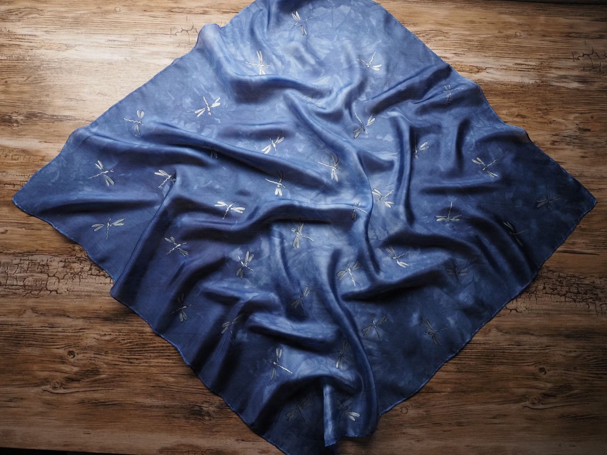 Ručně malovaný šátek z přírodního hedvábí (pongé 5). Použití kvalitních barev a tepelné fixace zaručuje dlouhodobou odolnost při opakovaném praní. Snadno se žehlí.