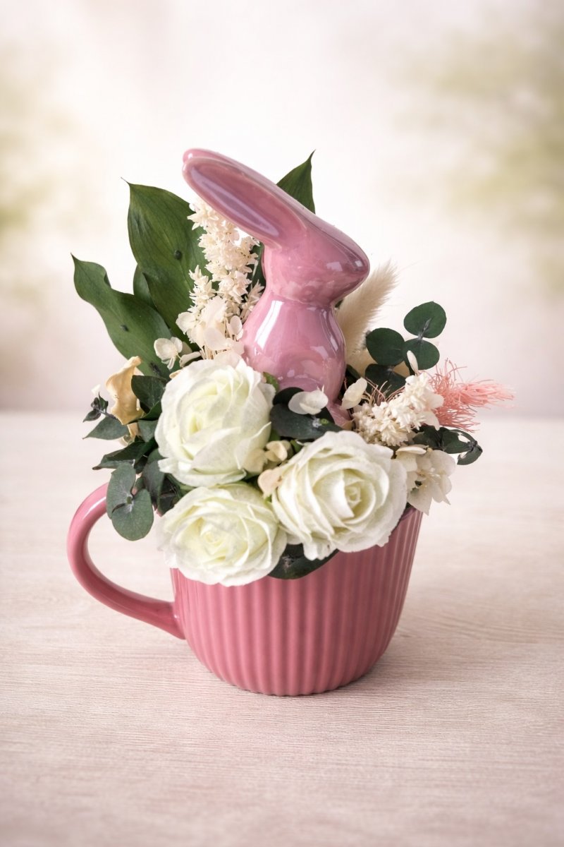 Keramický hrníček se zajíčkem, umělými a stabilizovanými květinami a zelení. Výška ařanžmá 23 cm, šířka 14 cm.