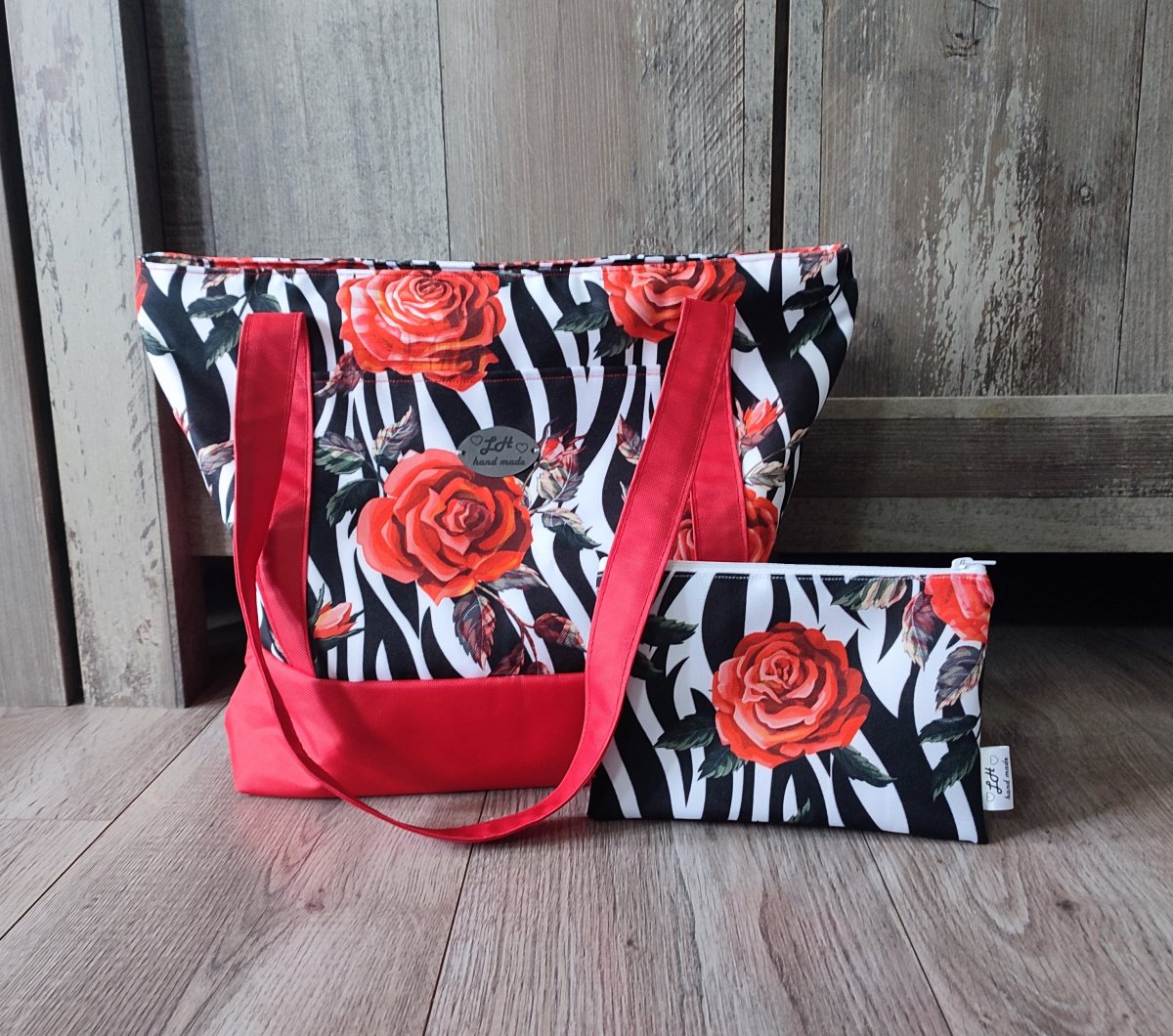 Kombinace červené kočárkoviny s kočárkovinou s červenými růžemi na zebrovaném podkladě.