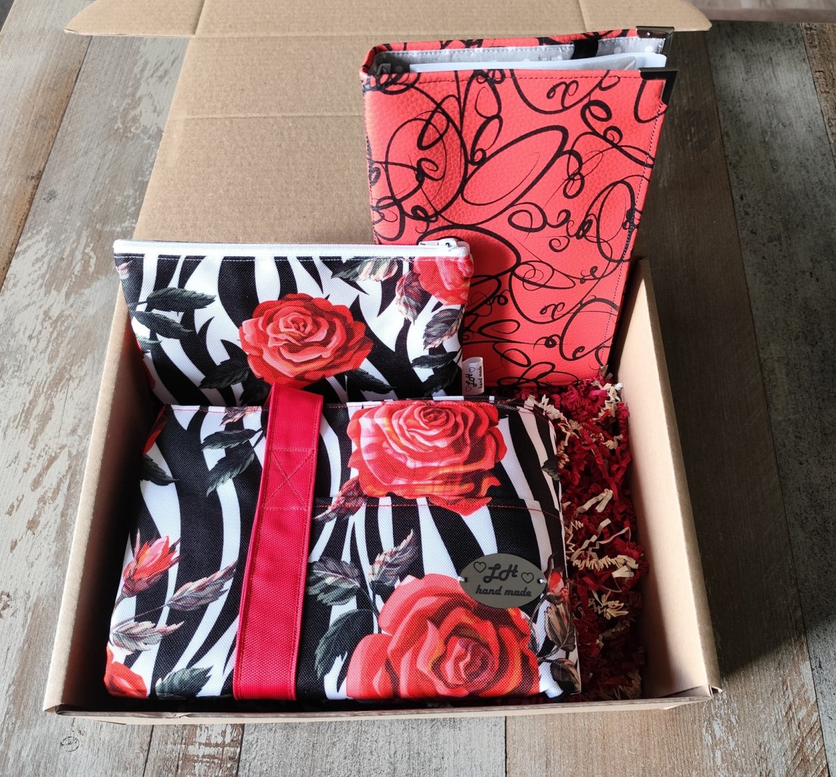 Dárková sada obsahuje kabelku a taštičku na drobnosti a karis blok A5 - úzký v červené a černé barvě. Dárkově zabaleno v kartonové krabici vystlané barevnou výplní. Krabice má rozměry: 32 x 25 x 11 cm