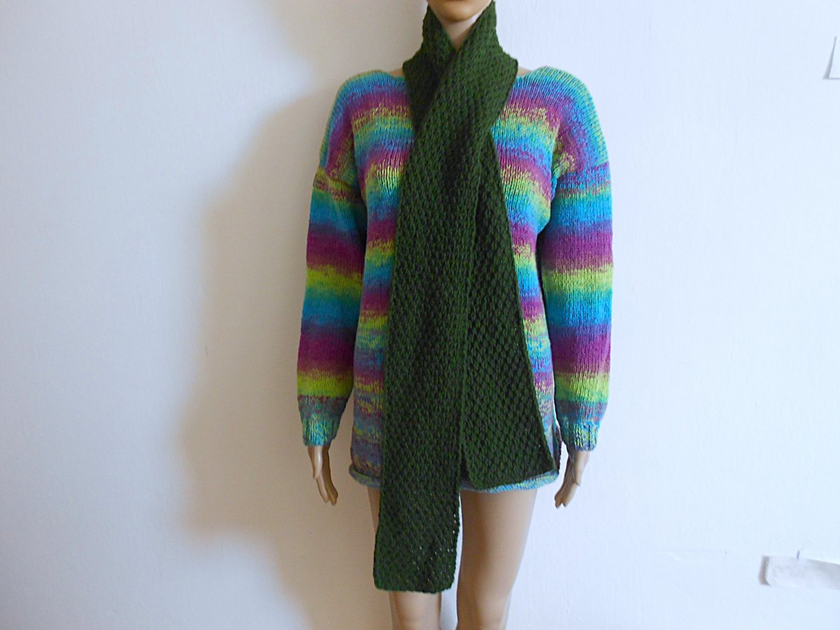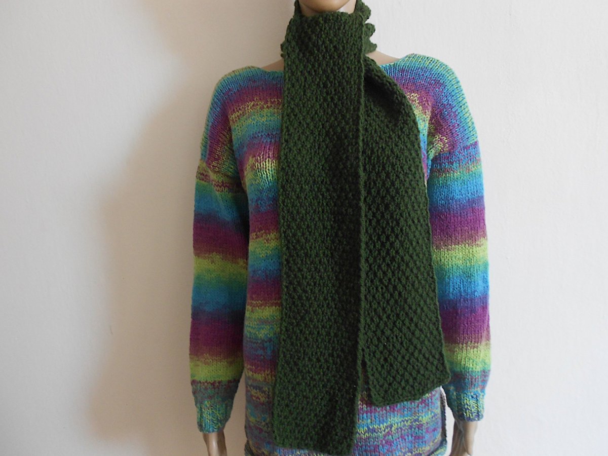 Ručně pletená, pružná, střední šála khaki. Velikost: délka 170cm, šířka 11,5cm. Doporučuji ruční praní nebo v pračce program na vlnu, sušit volně položené.