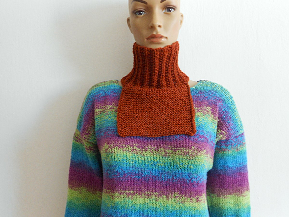 Ručně pletený, pružný, velký nákrčník, rezavý, obvod 40-62cm, vrchní díl se může ohrnout - viz. 2. fotografie, spodní díl šířka 18 cm, délka 14 cm. Pánský, dámský.