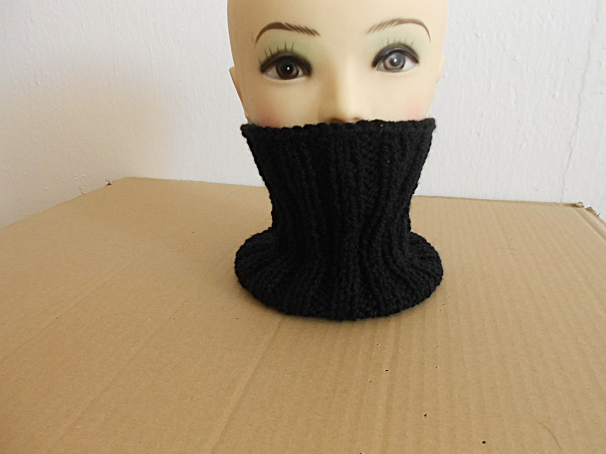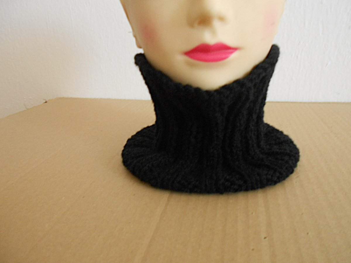 Ručně pletený, větší nákrčník, dvojitý, výšku si můžete přizpůsobit ohrnutím. Velmi pružný. Materiál 30% vlna, 70% akryl, černý. Doporučuji ruční praní, při praní v pračce použít program na vlnu.