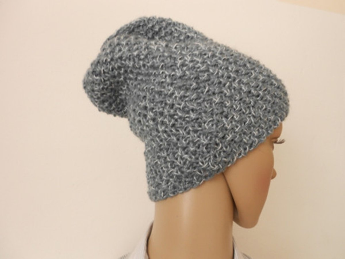 Ručně pletená, pružná čepice, šedo - bílá. Je vlněná, s malým množstvím akrylu. Velikost: výška 25cm, obvod hlavy 53-60cm. Doporučuji jemné, ruční praní a sušit volně položené. Barevně odpovídá hlavní fotografie.