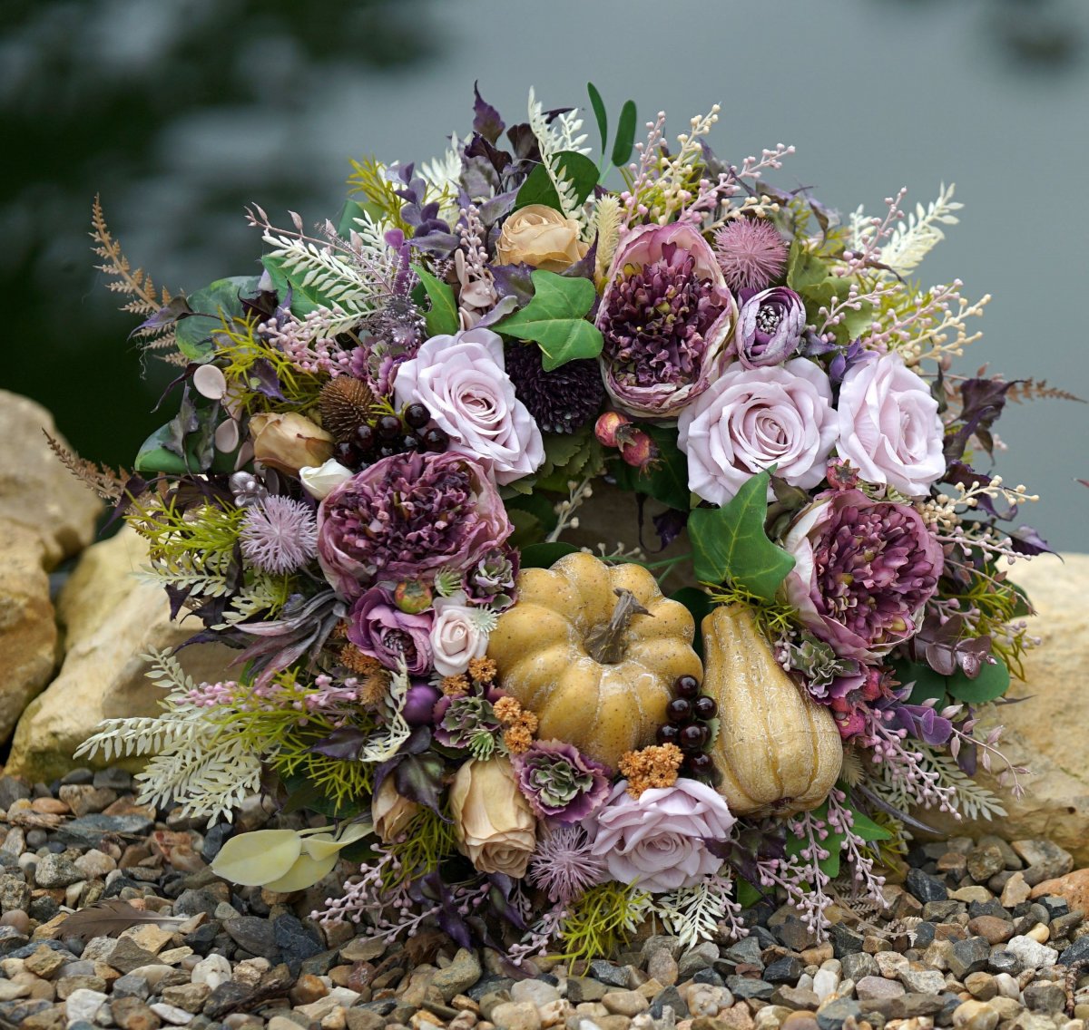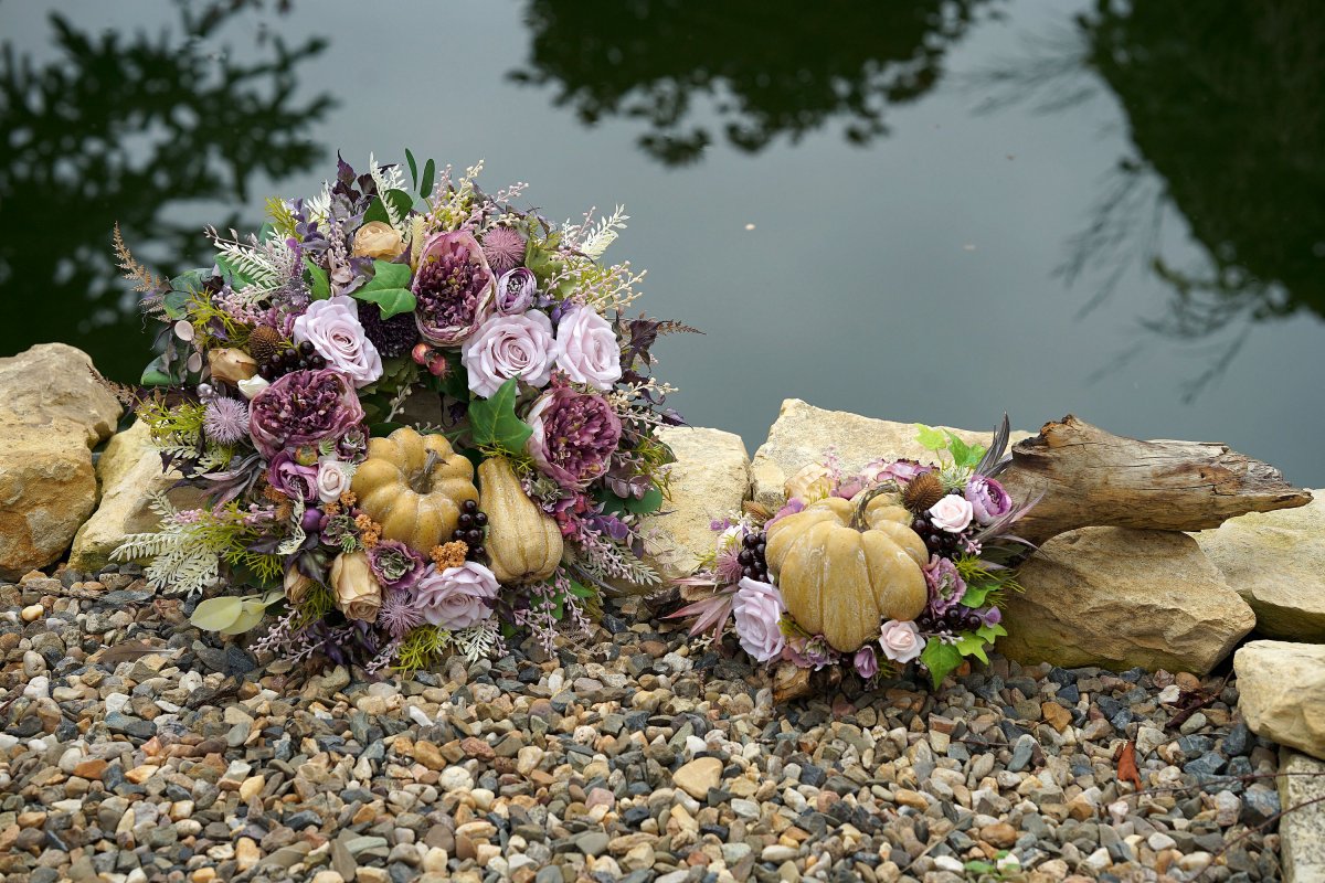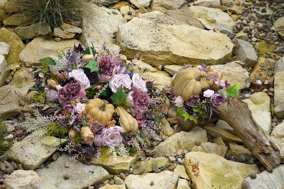 Podzimní věnec v jemných barvách vřesu a okru. S dýněmi a spoustou květin.