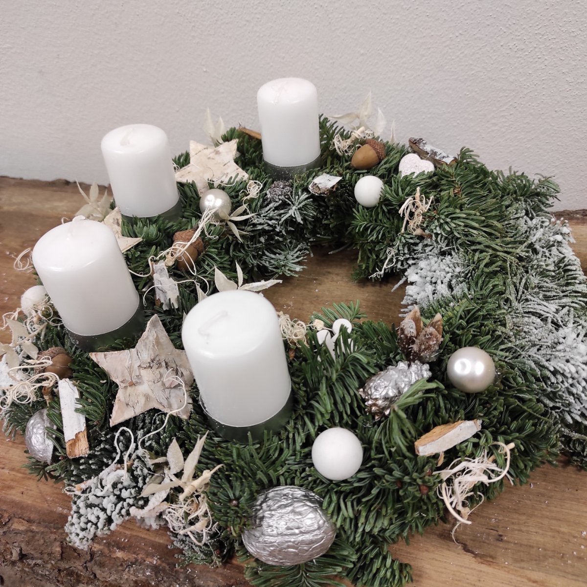 Přírodní adventní věnec vytvořený vázáním čerstvé chvojí Abiens Nobilis - profesionální neopadavá aranžérská chvojí, chvojí na větvičkách uschne, ale neopadá, nesprchne, věnec dozdobený přírodními doplňky, skleněné a plastové vánoční koule a doplňky, aranžérský sníh, 4x svíčka na hliníkových podstavcích v ceně věnce.