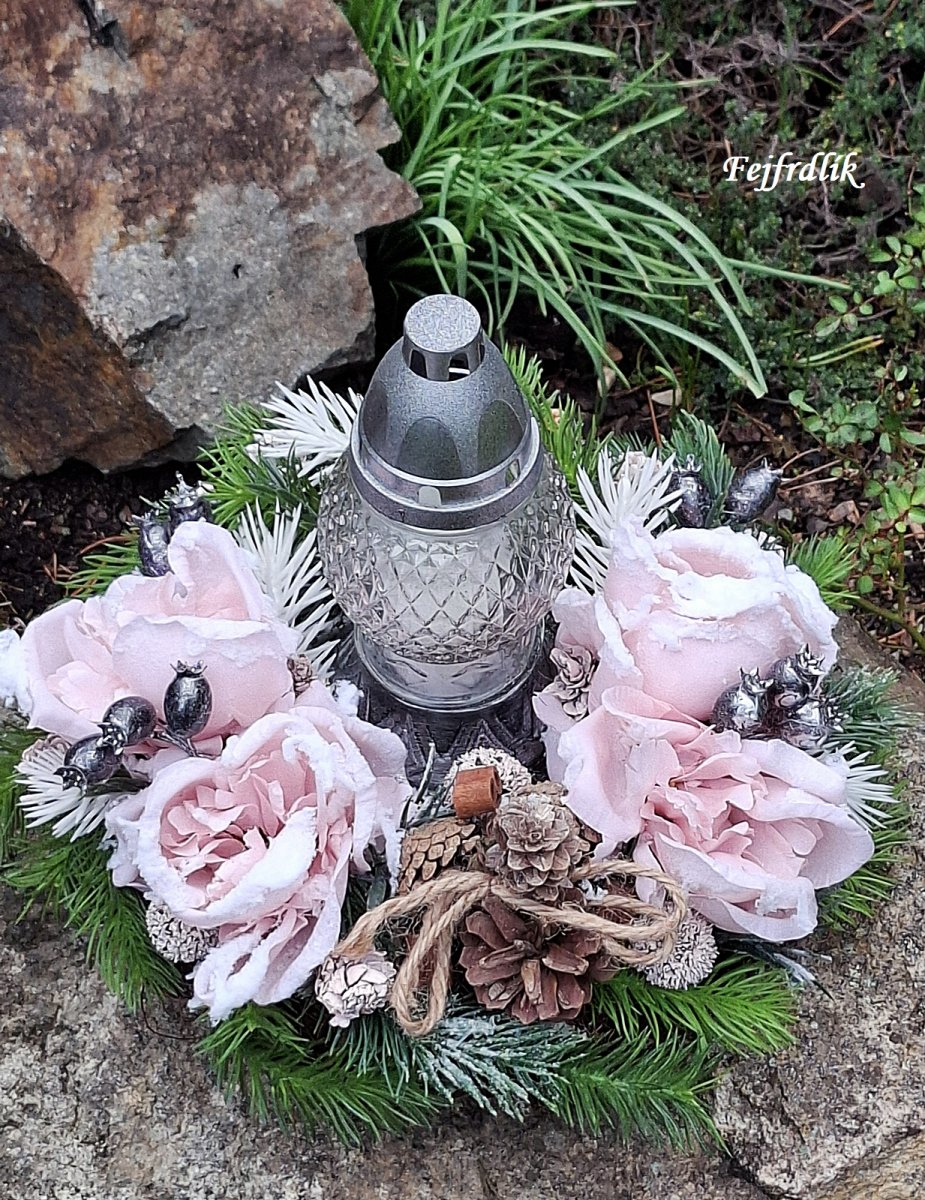 Hřbitovní dekorace s lampičkou (svíčka se dá měnit) s umělými růžemi a jehličím, šípky ..